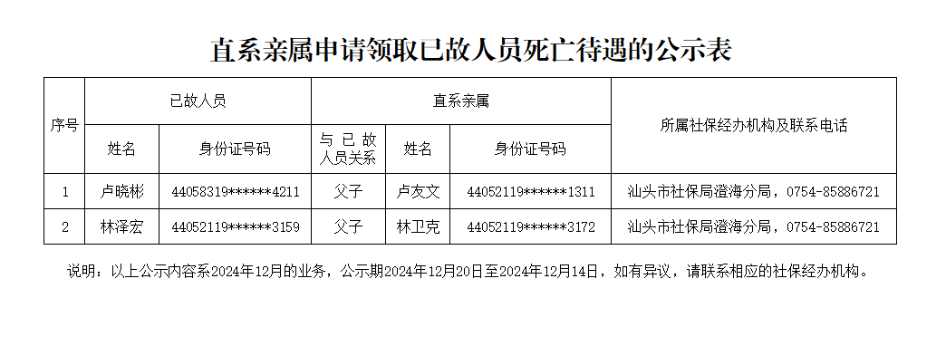市社保局澄海分局《直系亲属申请领取已故人员死亡待遇的公示表》(2024.12.20)