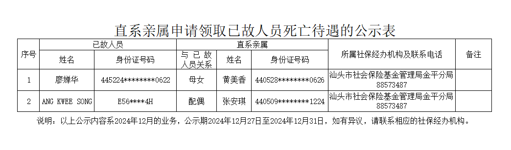 市社保局金平分局《直系亲属申请领取已故人员死亡待遇的公示表》(2024.12.27)
