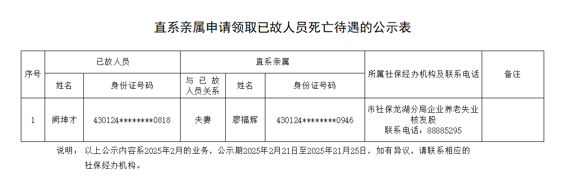 市社保局龙湖分局《直系亲属申请领取已故人员死亡待遇的公示表》(2025.02.21)