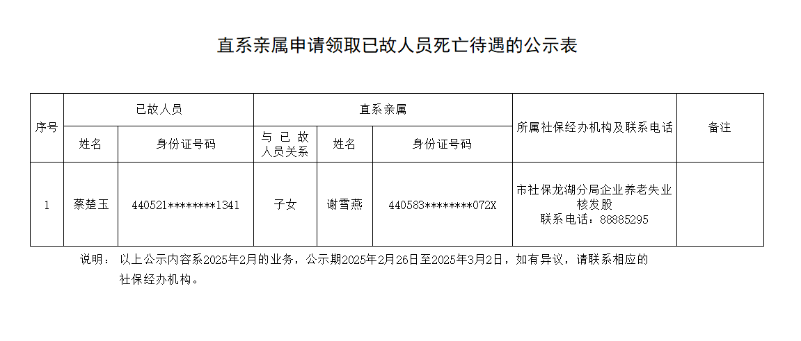 市社保局龙湖分局《直系亲属申请领取已故人员死亡待遇的公示表》(2025.02.25)