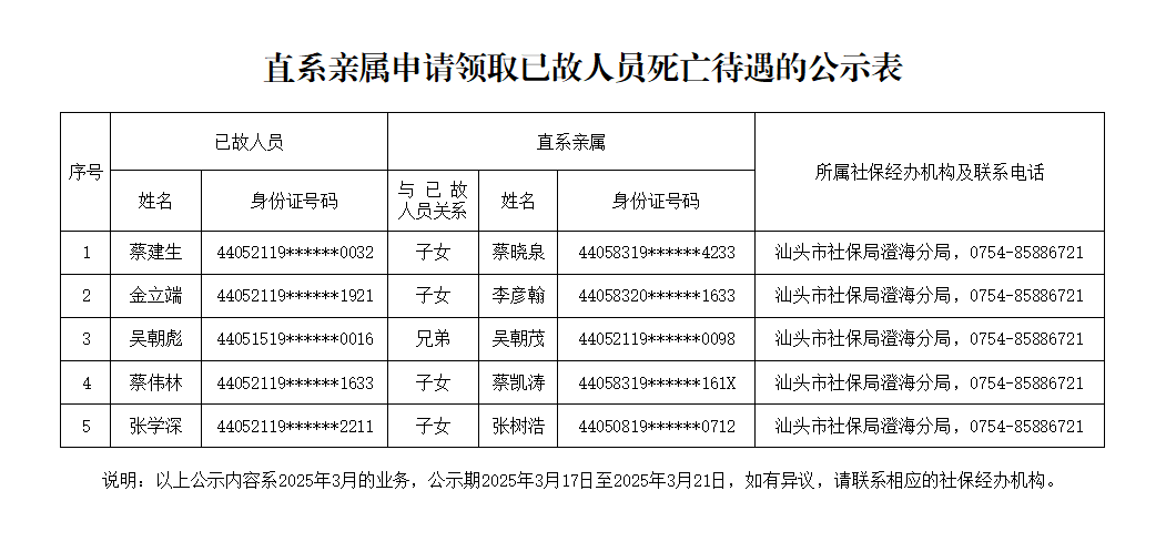 市社保局澄海分局《直系亲属申请领取已故人员死亡待遇的公示表》(2025.03.17)
