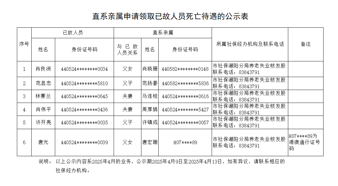 市社保局潮阳分局《直系亲属申请领取已故人员死亡待遇的公示表》(2025.04.09)