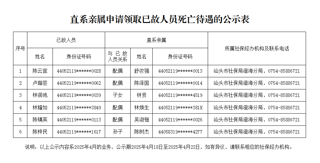 市社保局澄海分局《直系亲属申请领取已故人员死亡待遇的公示表》(2025.04.18)