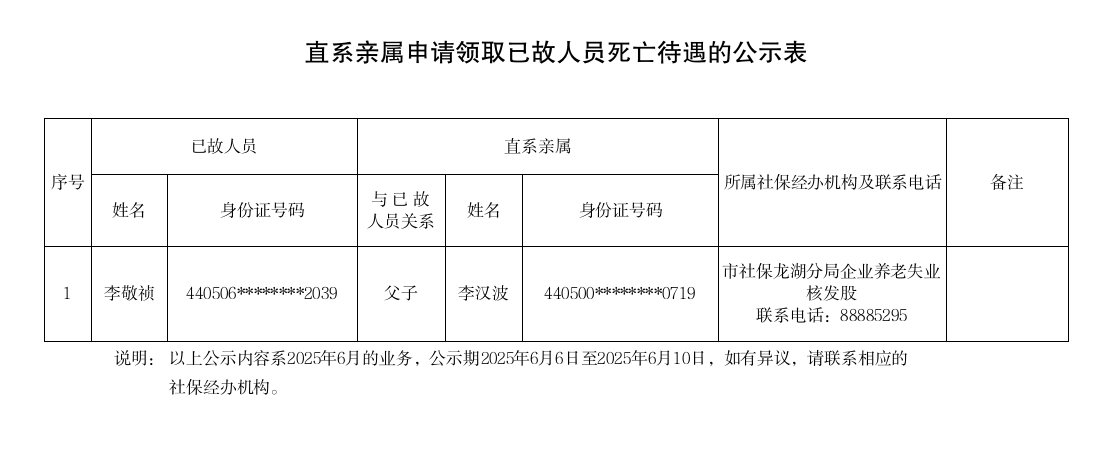 市社保局龙湖分局《直系亲属申请领取已故人员死亡待遇的公示表》(2025.06.06)