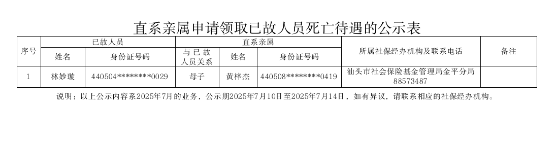 市社保局金平分局《直系亲属申请领取已故人员死亡待遇的公示表》(2025.07.10)