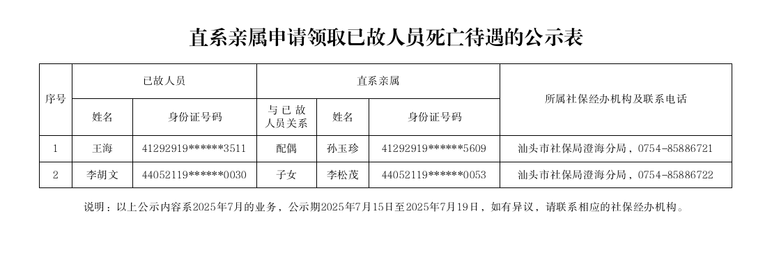 市社保局澄海分局《直系亲属申请领取已故人员死亡待遇的公示表》(2025.07.15)
