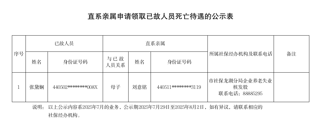 市社保局龙湖分局《直系亲属申请领取已故人员死亡待遇的公示表》(2025.07.29)2