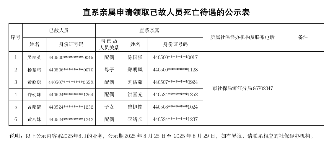 市社保局濠江分局《直系亲属申请领取已故人员死亡待遇的公示表》(2025.08.25)