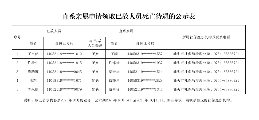 市社保局澄海分局《直系亲属申请领取已故人员死亡待遇的公示表》(2025.10.14)