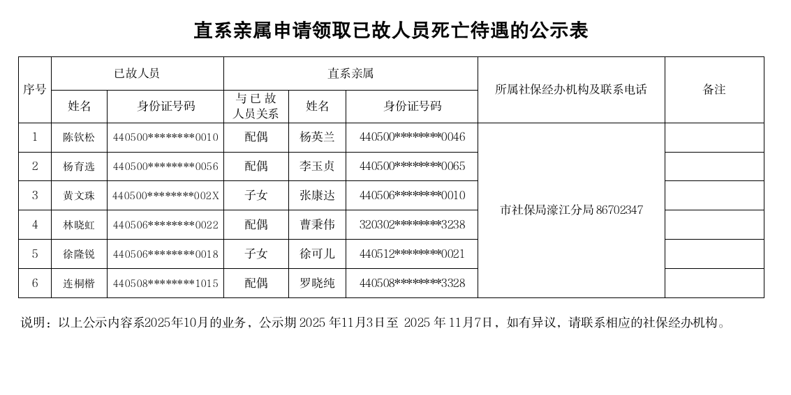 市社保局濠江分局《直系亲属申请领取已故人员死亡待遇的公示表》(2025.11.03)