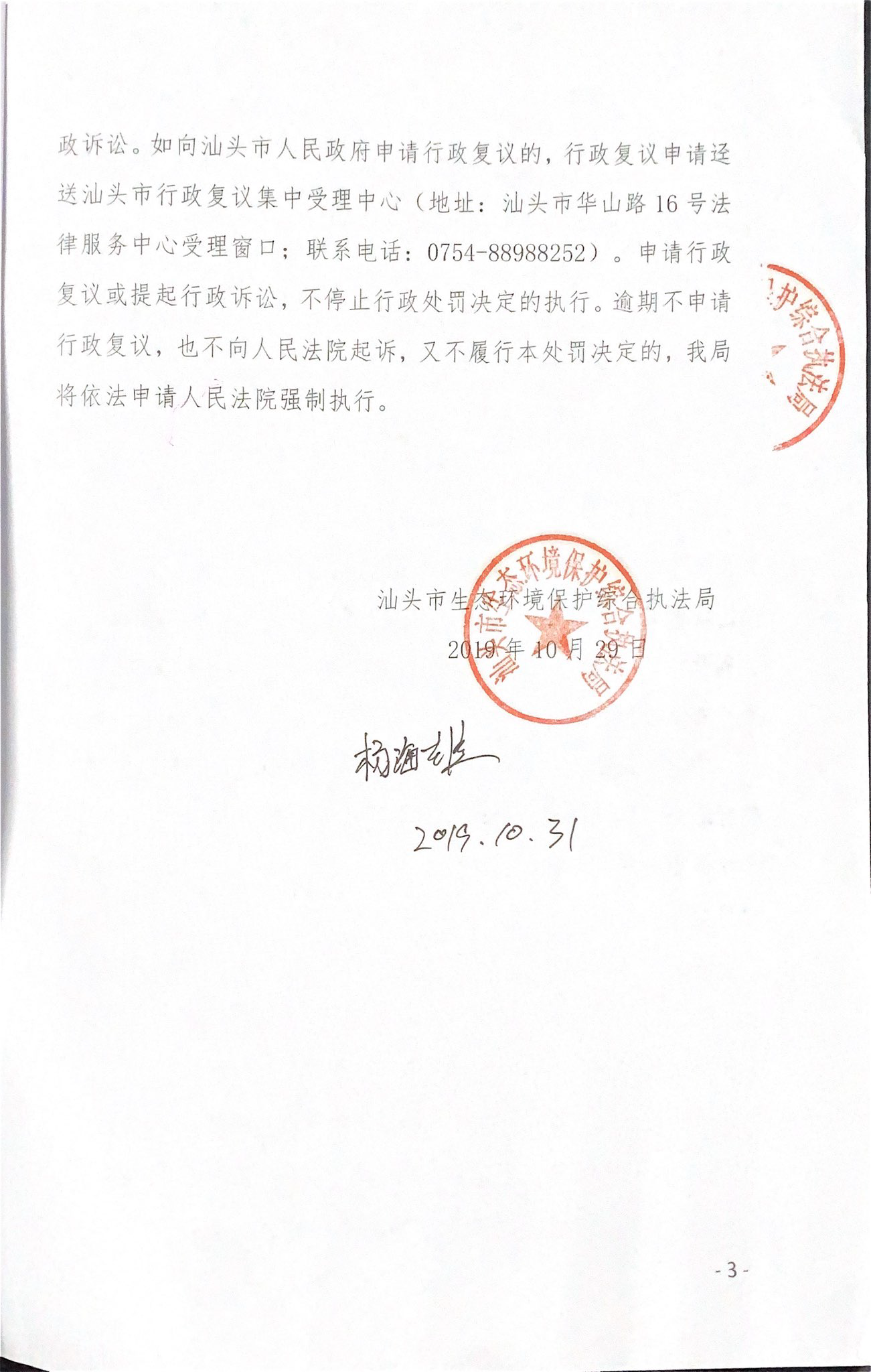 行政处罚决定书(汕环执罚〔2019〕22号)