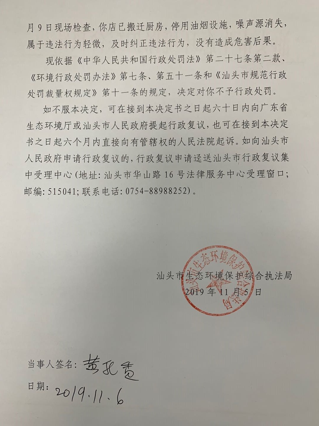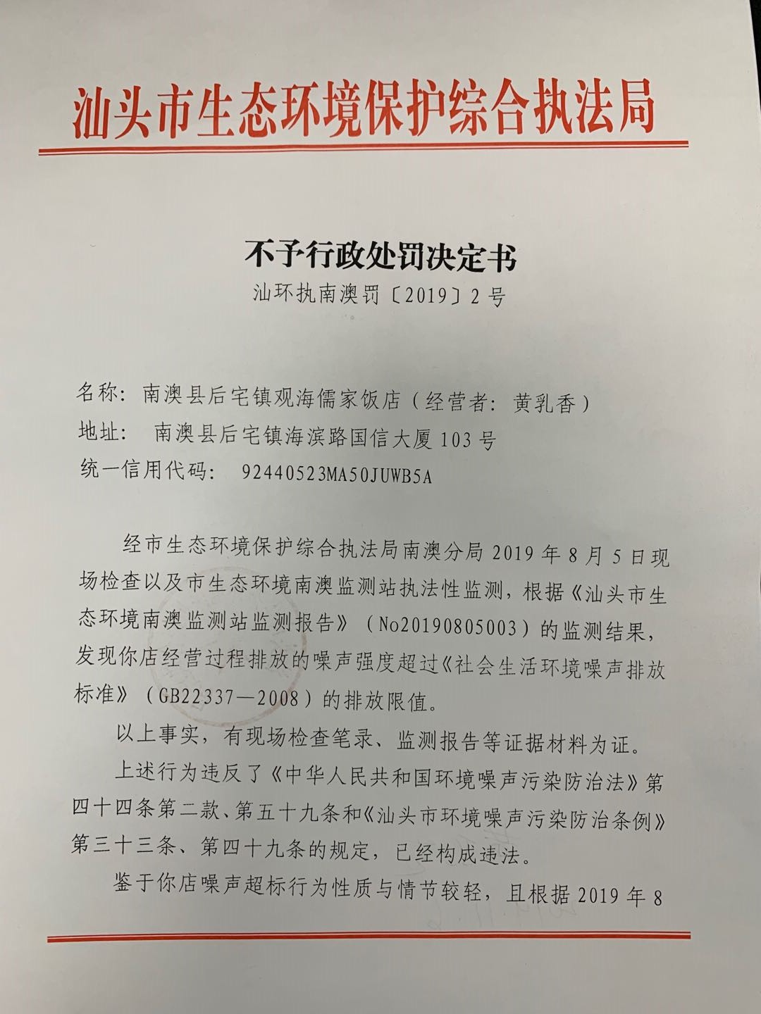 不予行政处罚决定书(汕环执南澳罚〔2019〕2号)