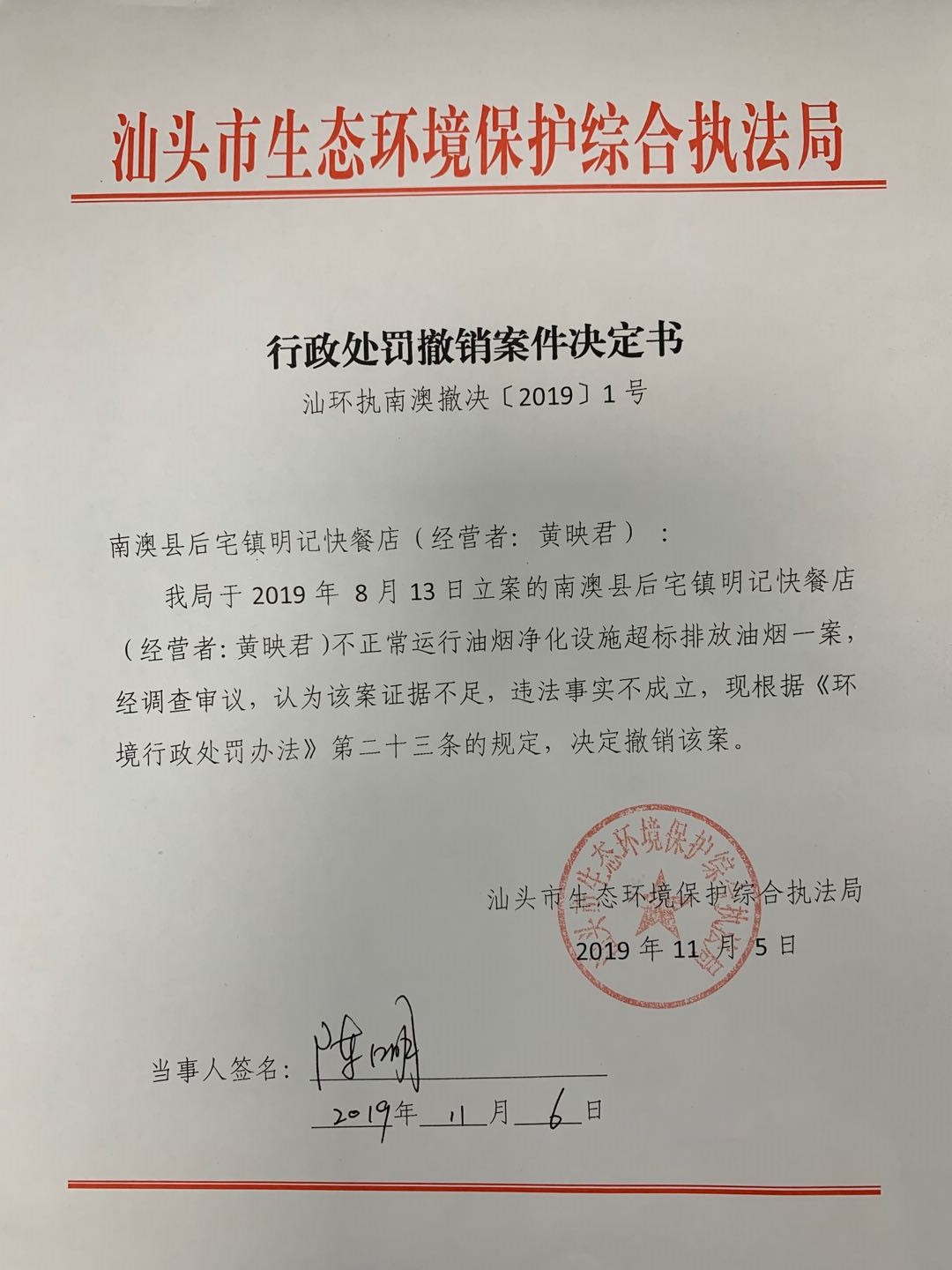 行政处罚撤销案件决定书(汕环执南澳撤决〔2019〕1号)