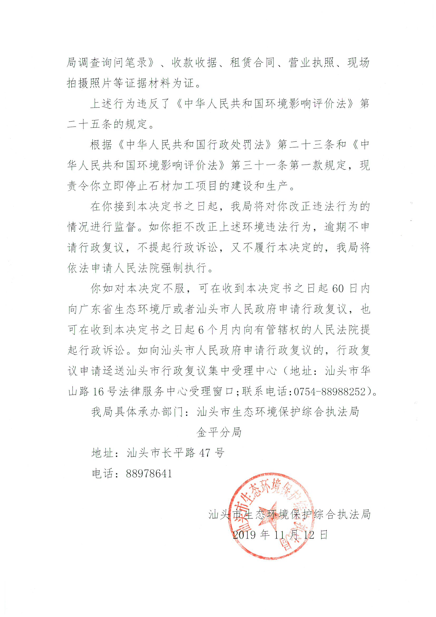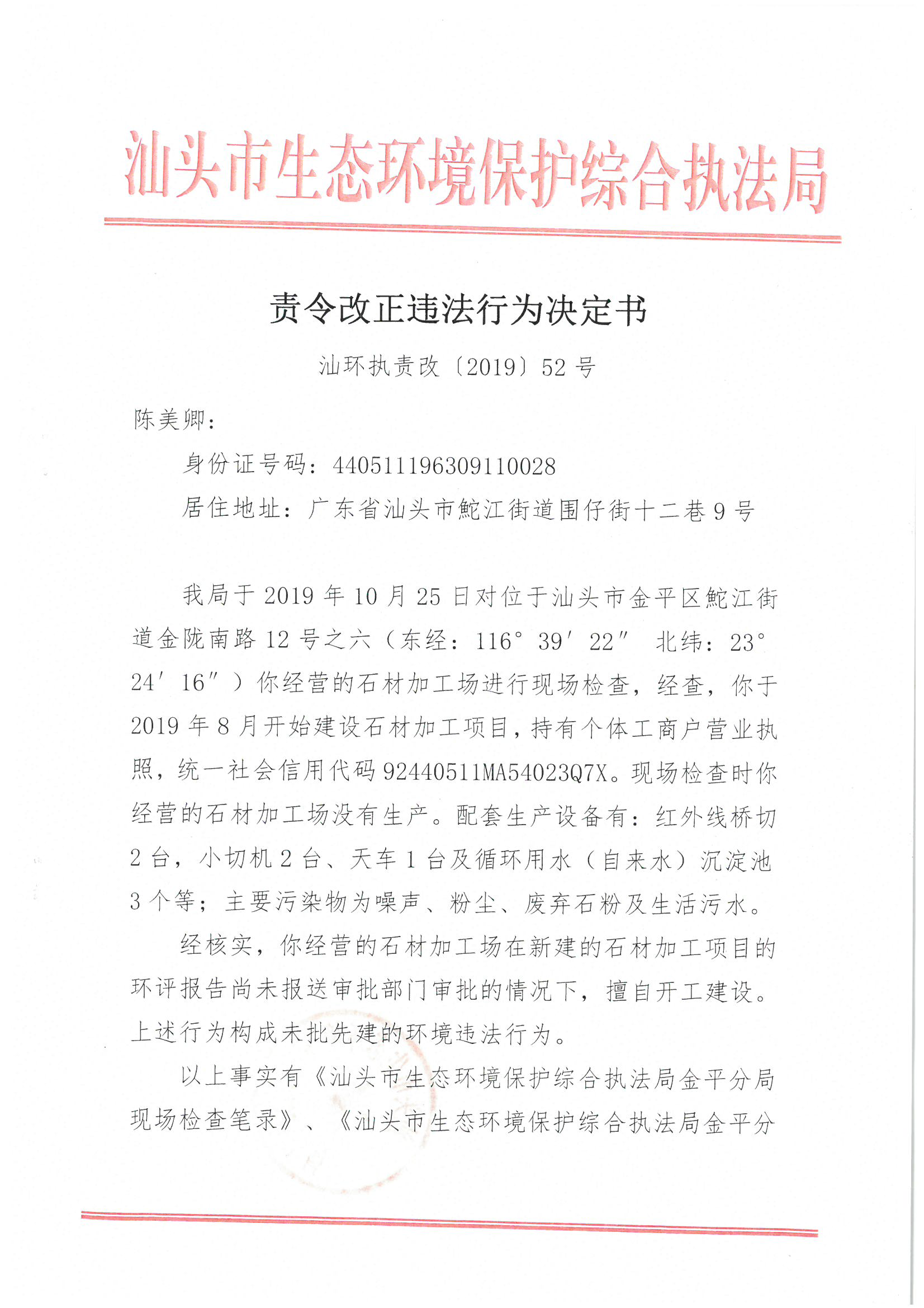责令改正违法行为决定书(汕环执责改〔2019〕52号)