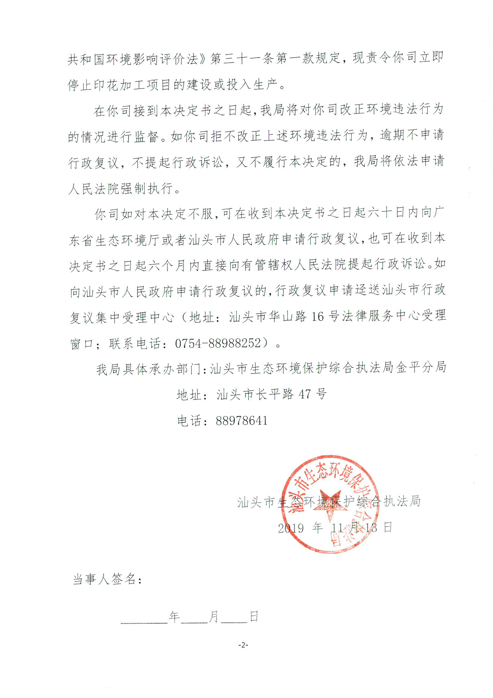 责令改正违法行为决定书(汕环执责改〔2019〕54号)