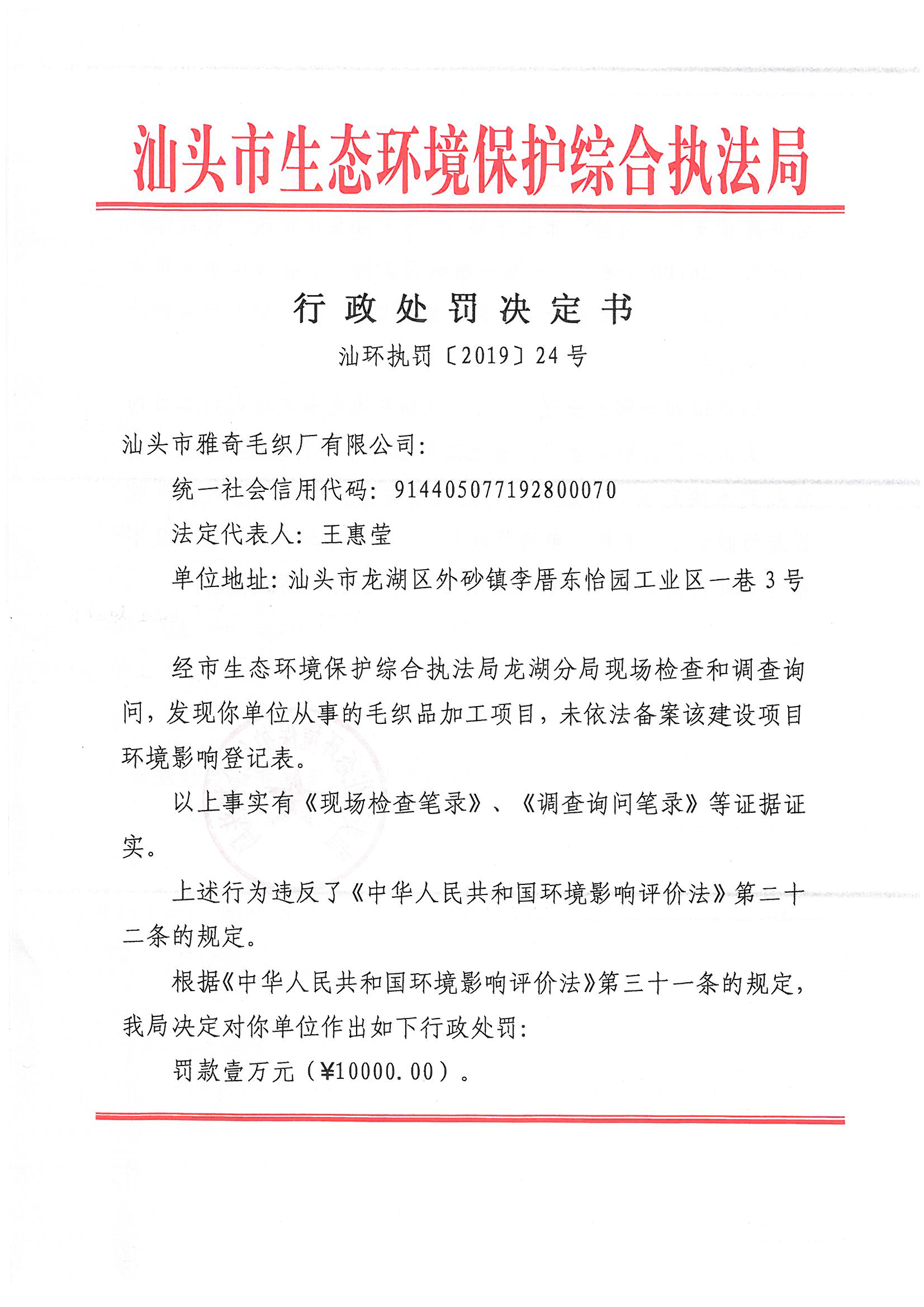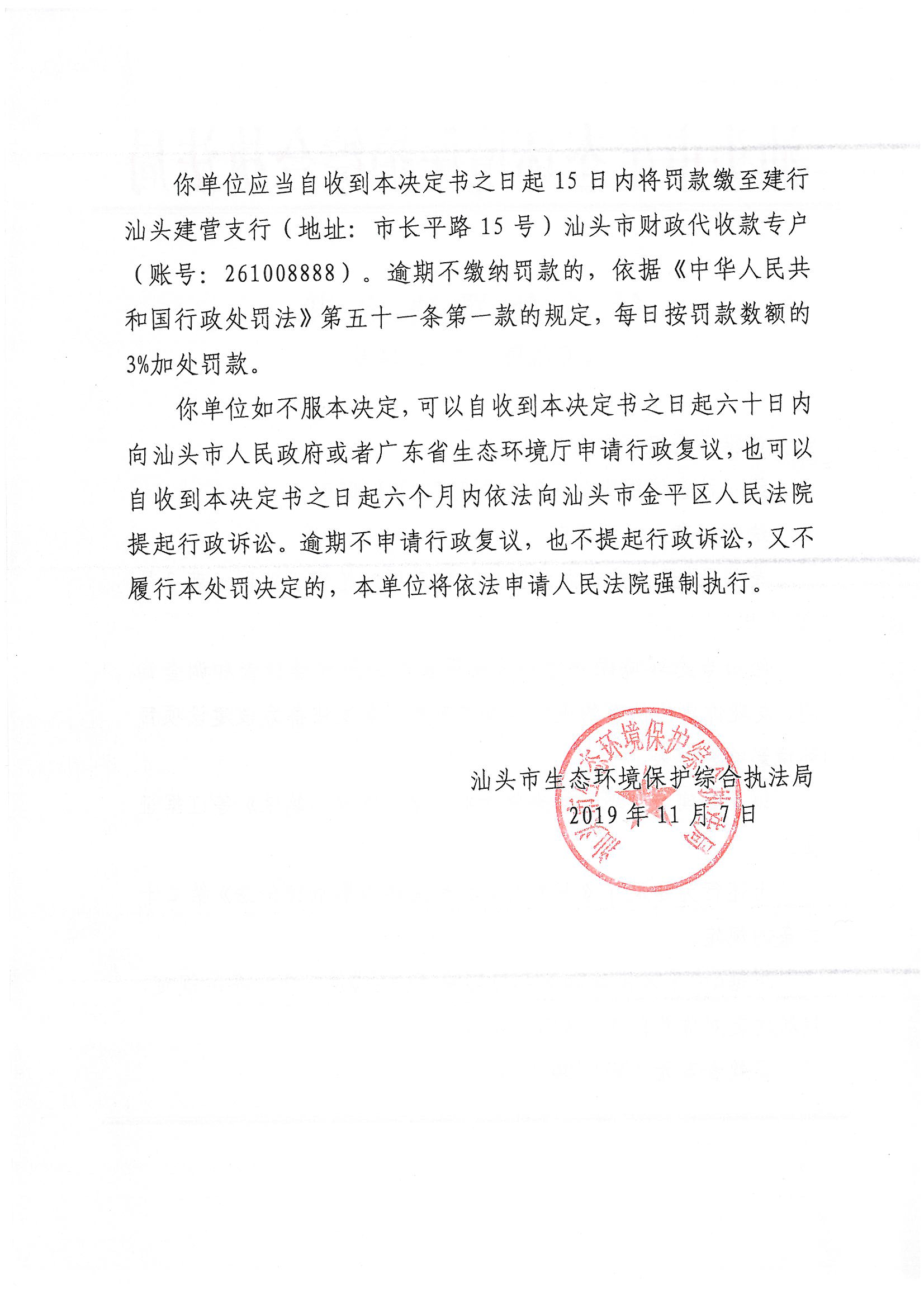 行政处罚决定书(汕环执罚〔2019〕24号)