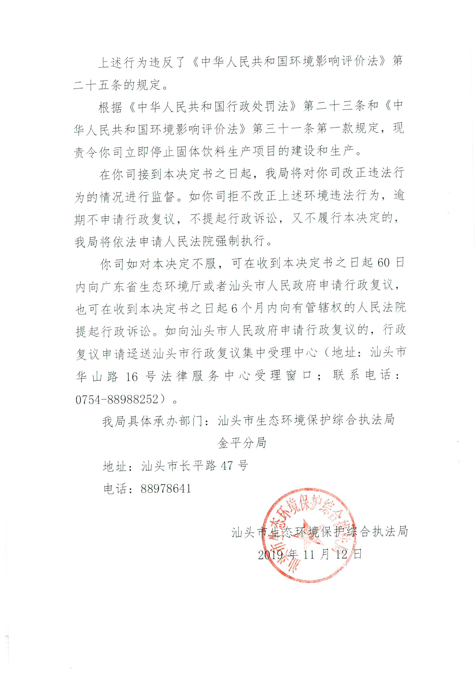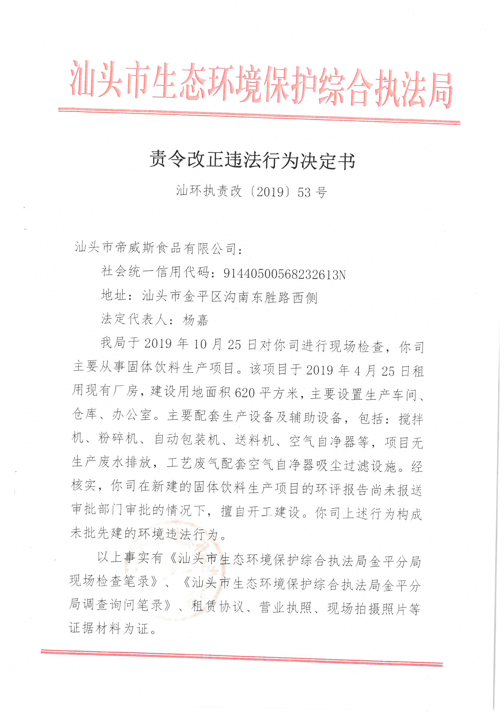 责令改正违法行为决定书(汕环执责改〔2019〕53号)