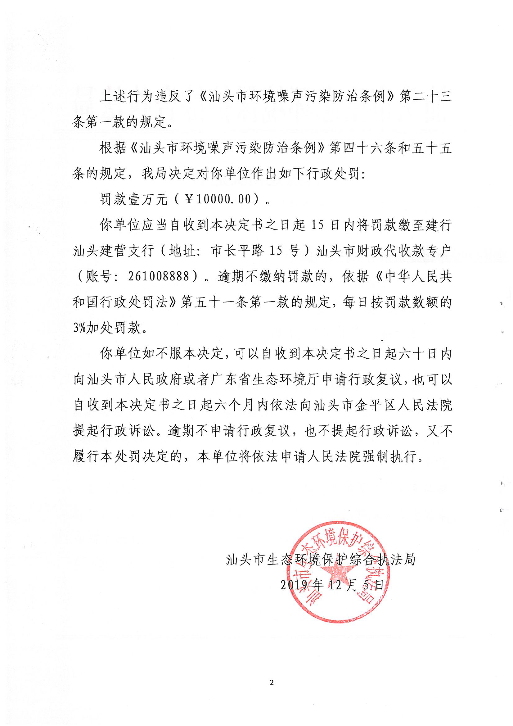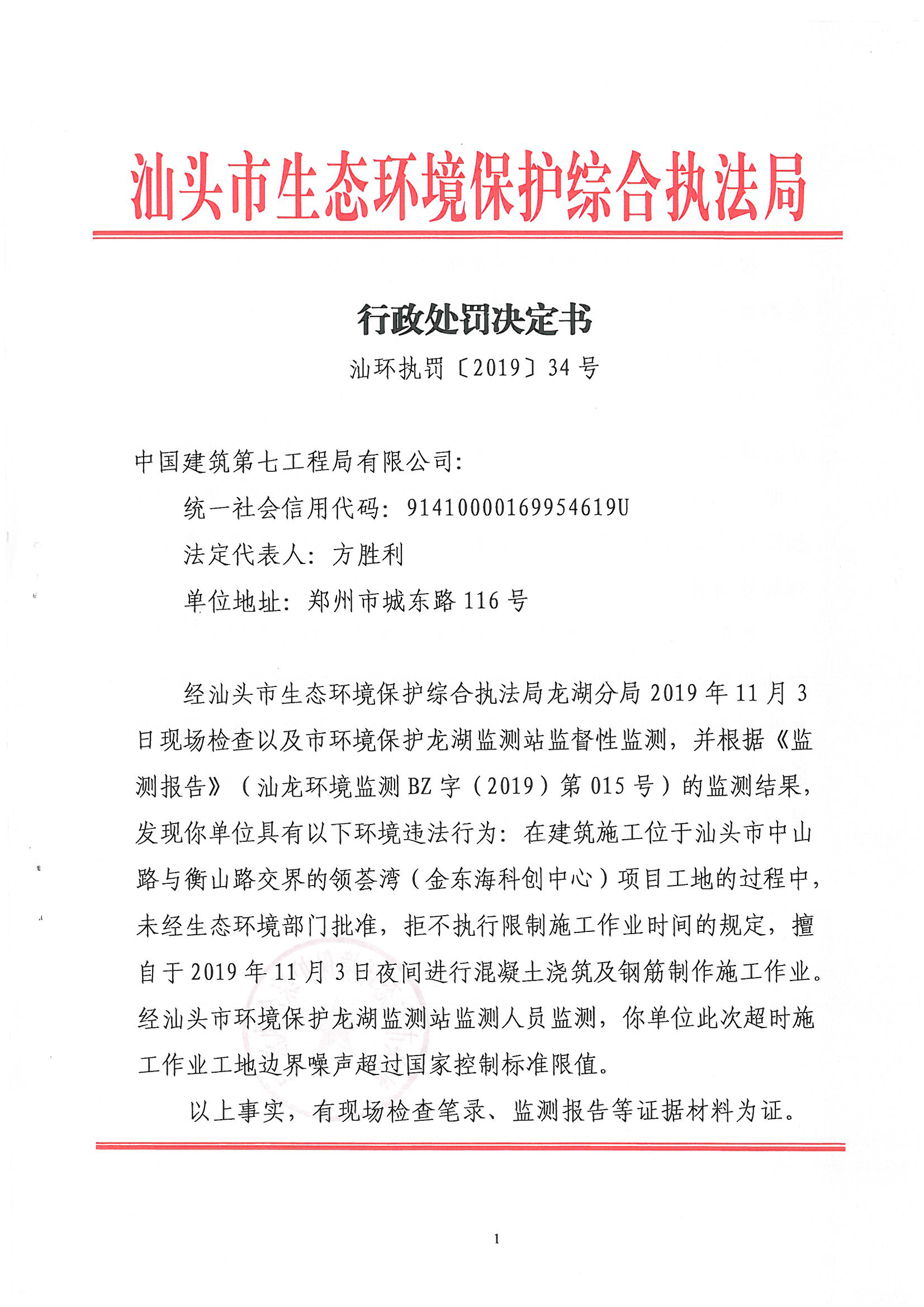 行政处罚决定书(汕环执罚〔2019〕34号)