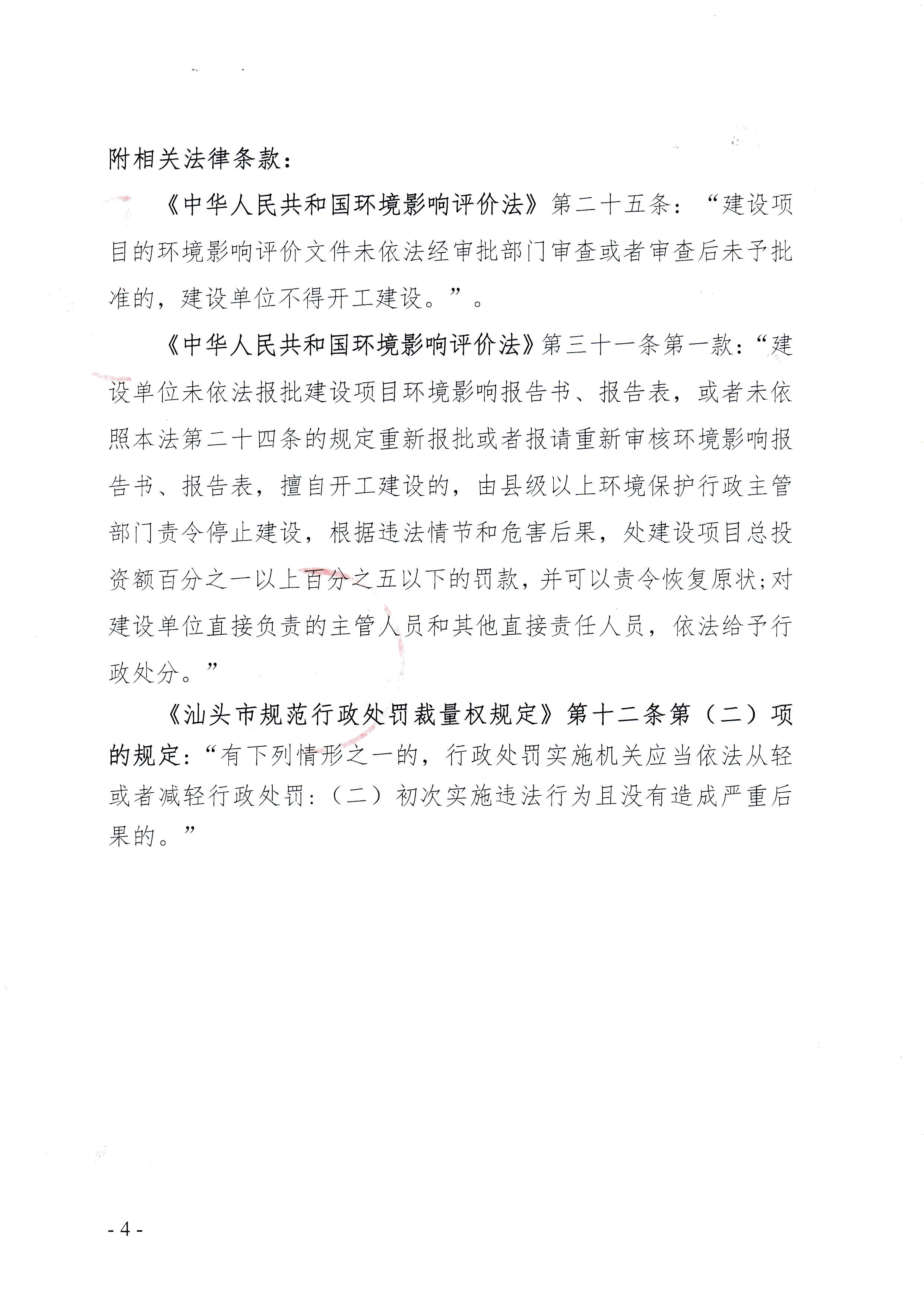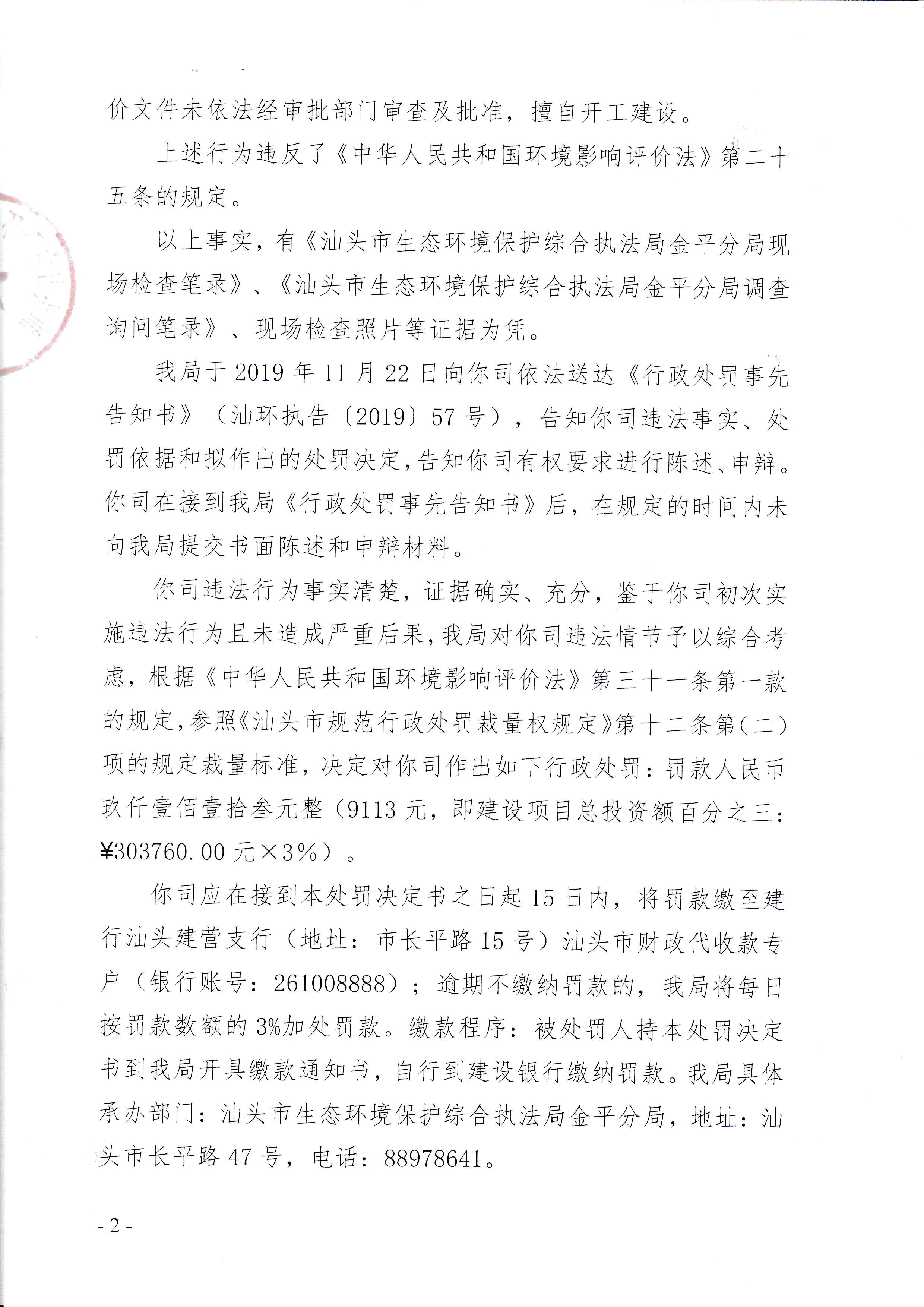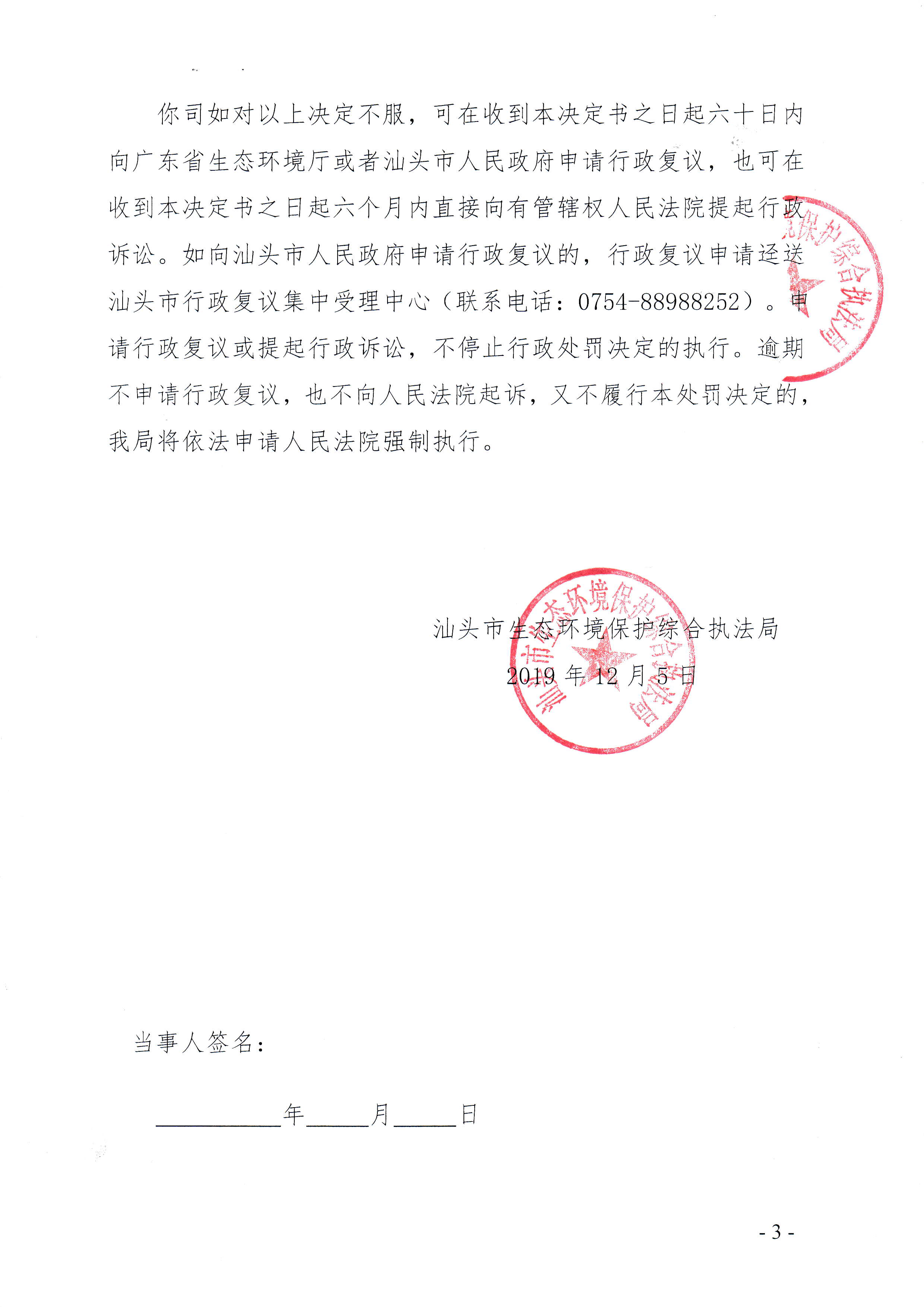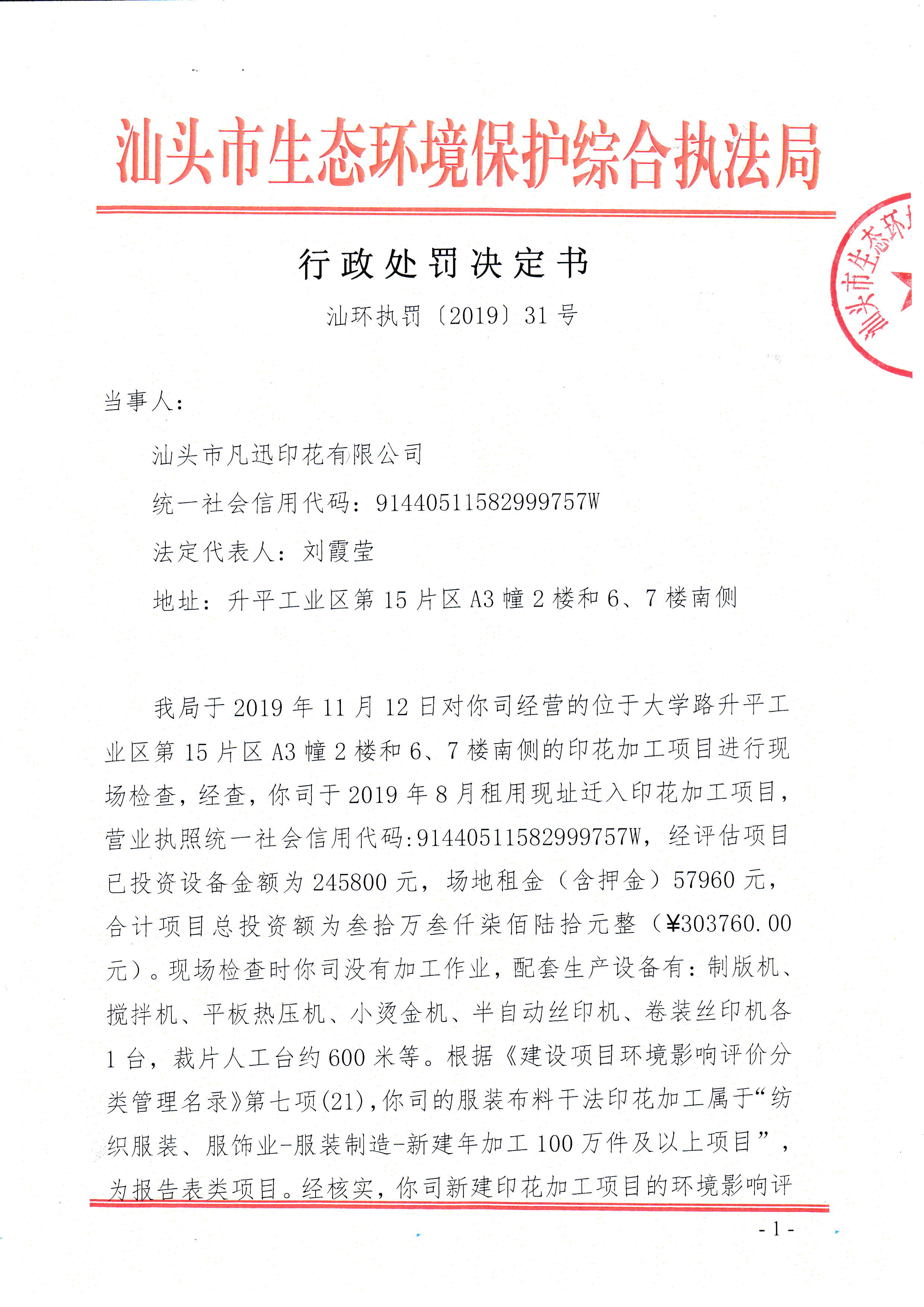 行政处罚决定书(汕环执罚〔2019〕31号)