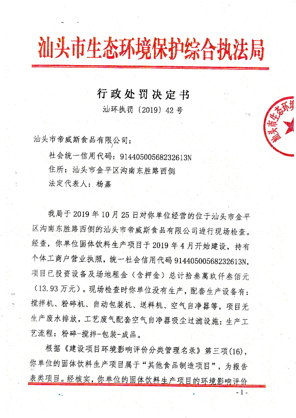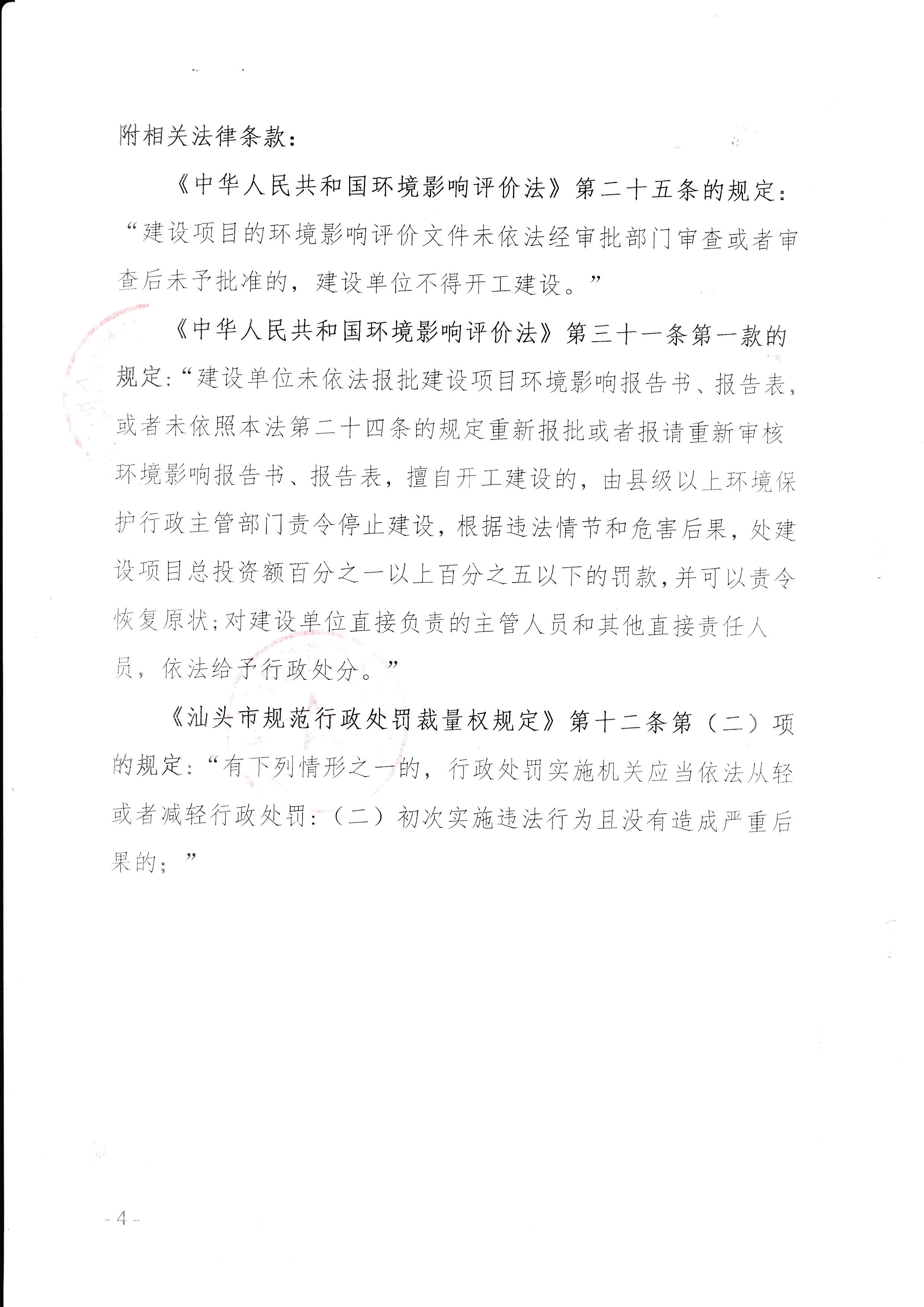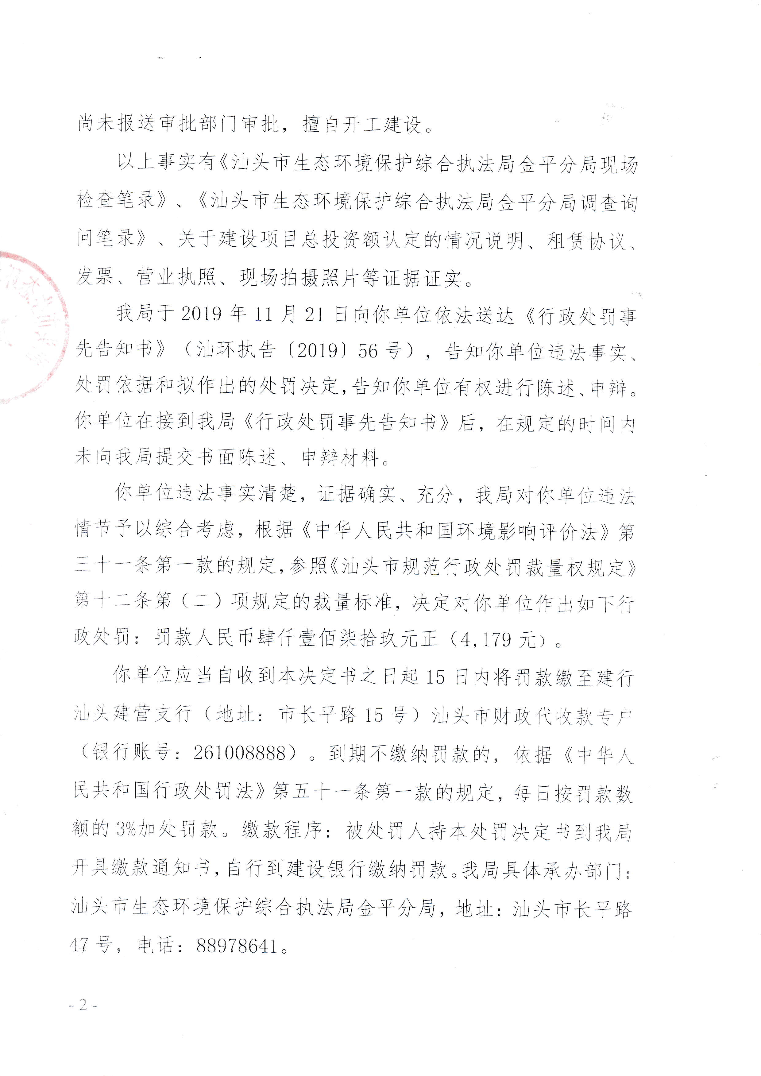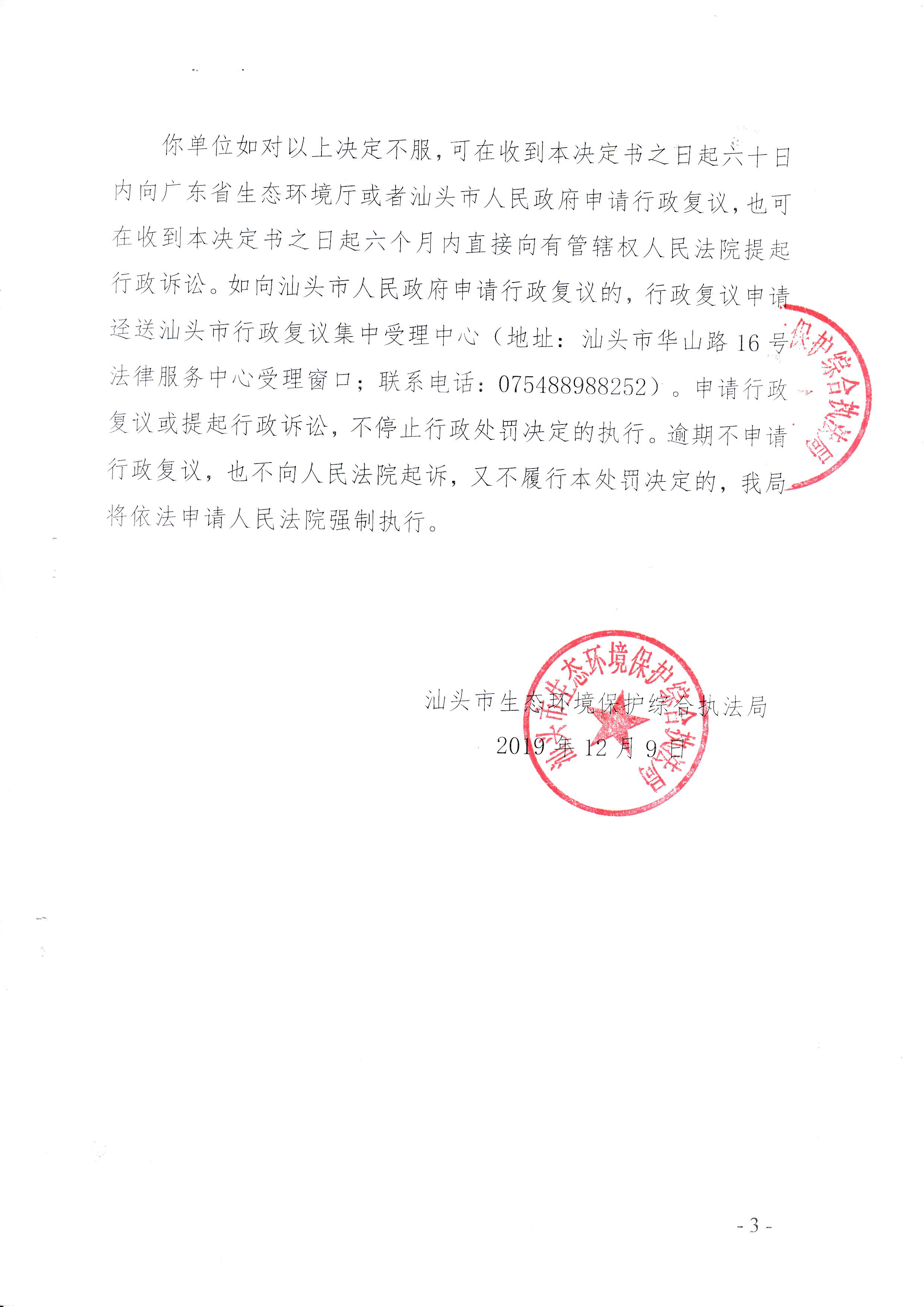行政处罚决定书(汕环执罚〔2019〕42号)