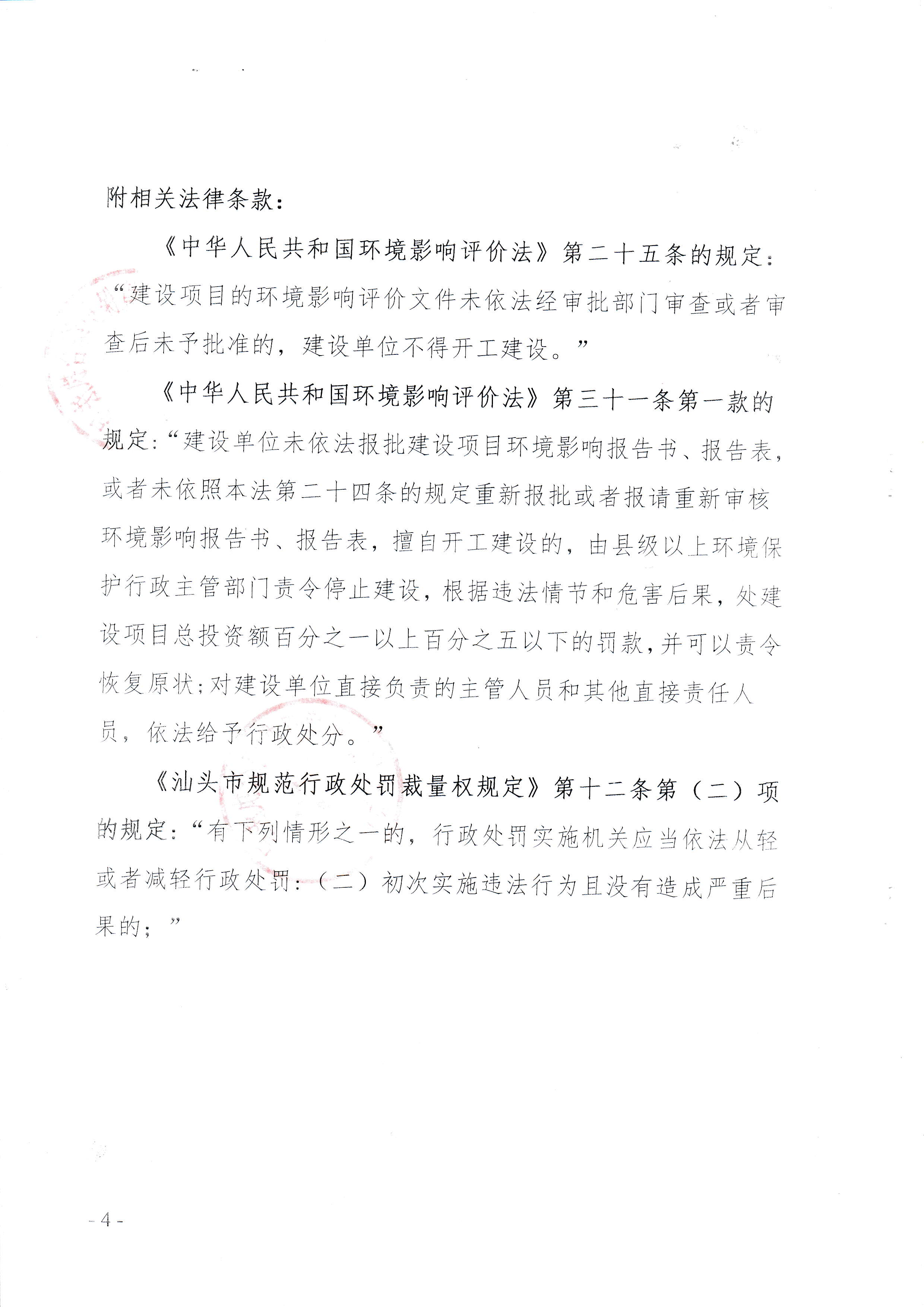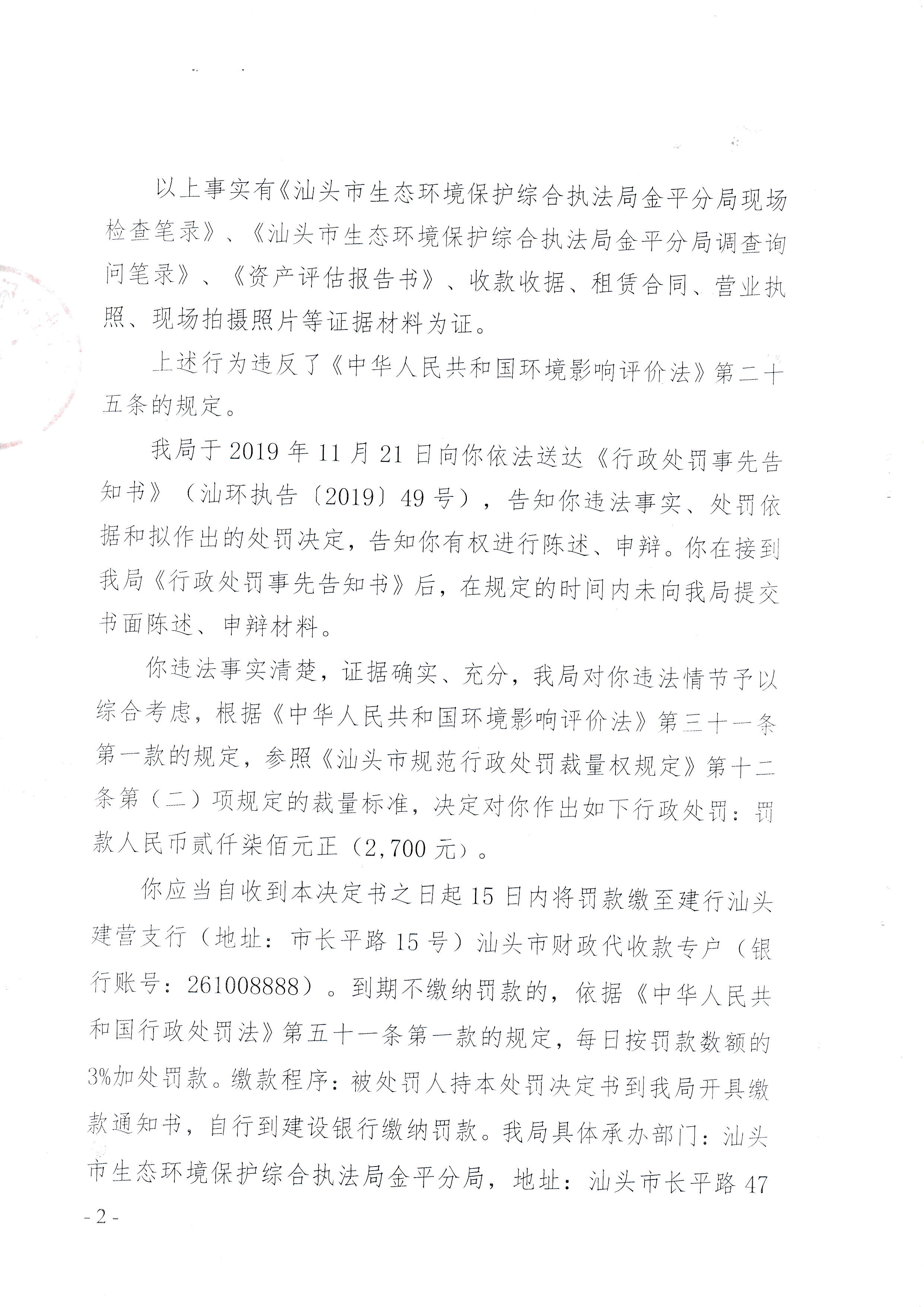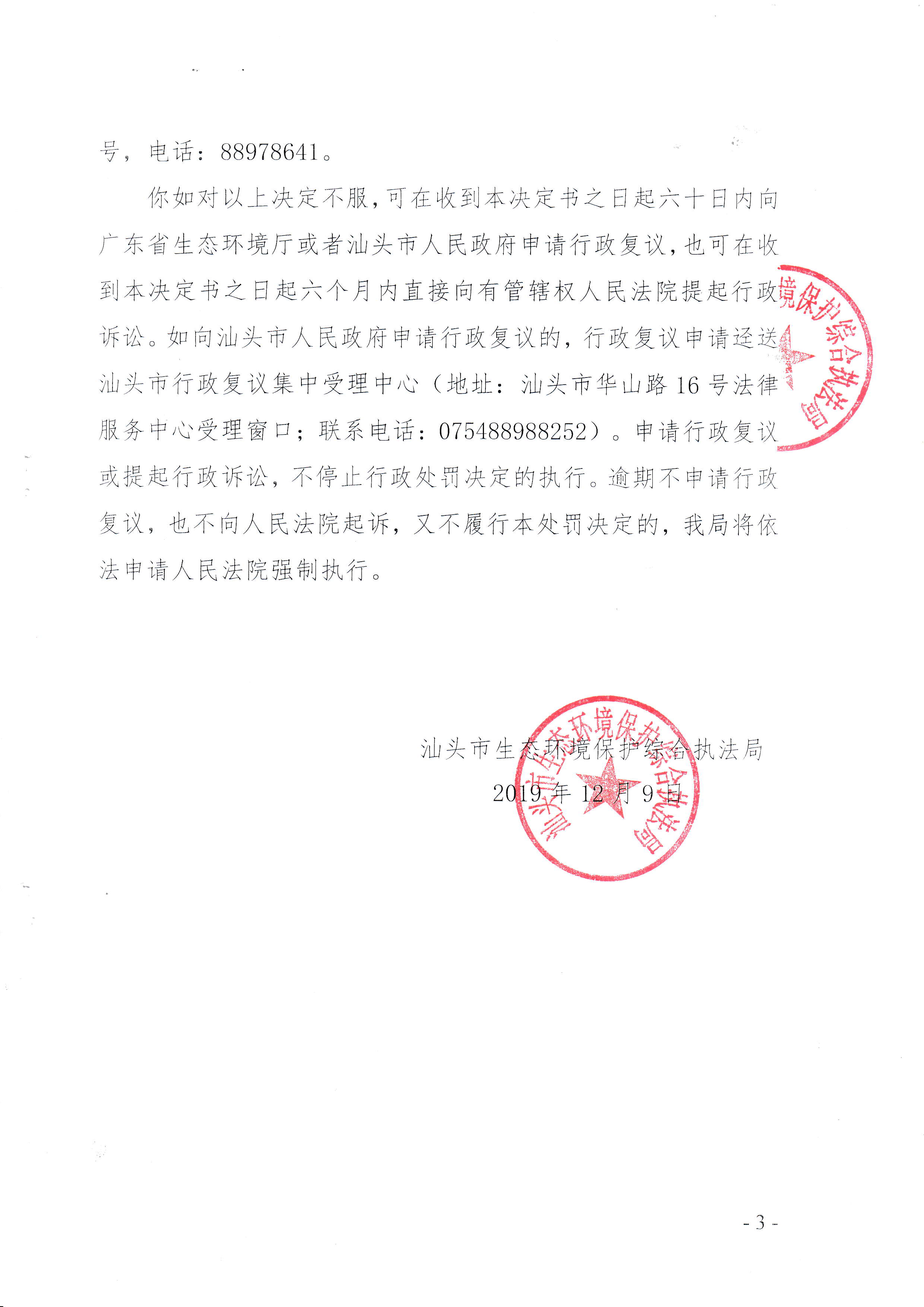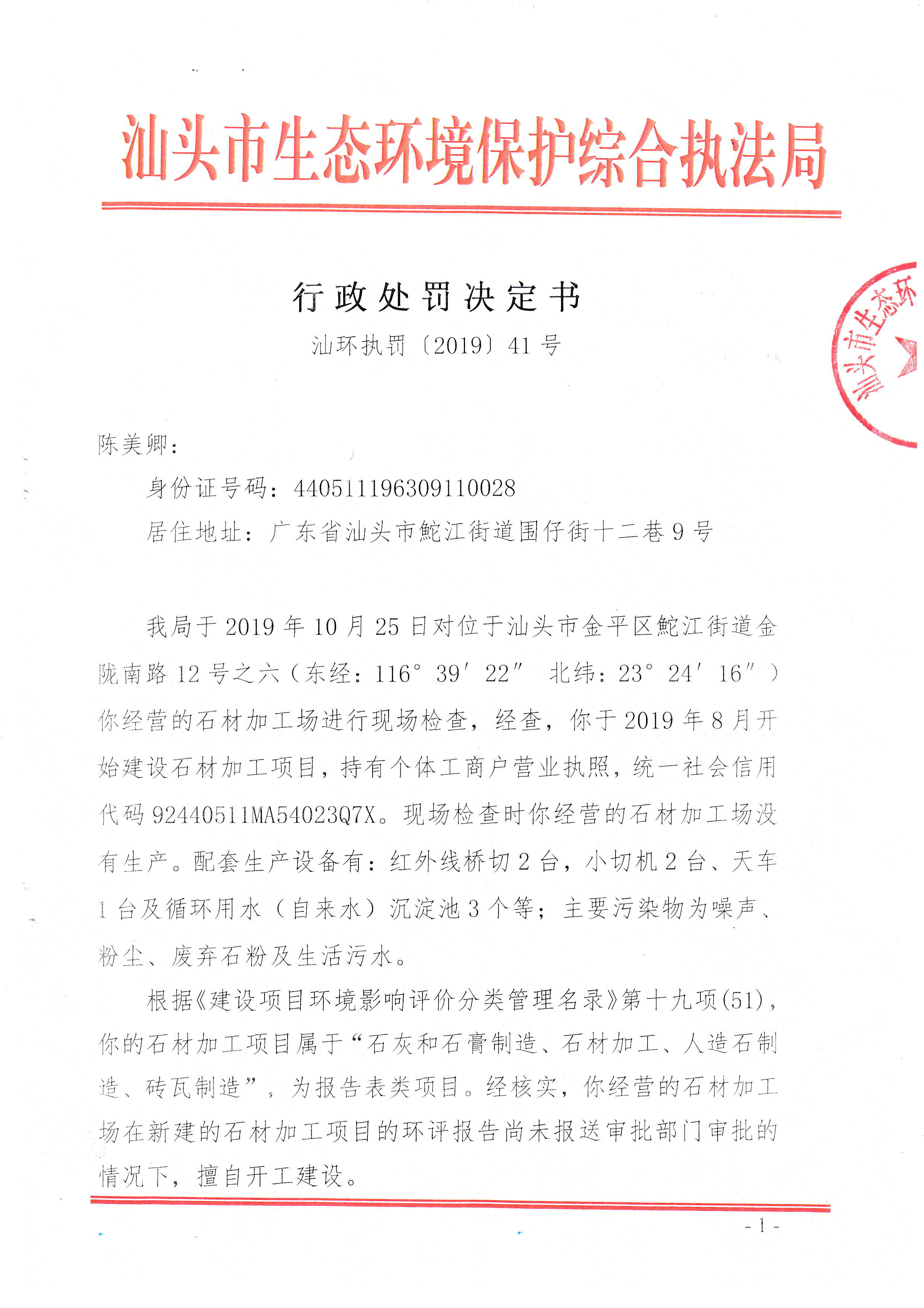 行政处罚决定书(汕环执罚〔2019〕41号)