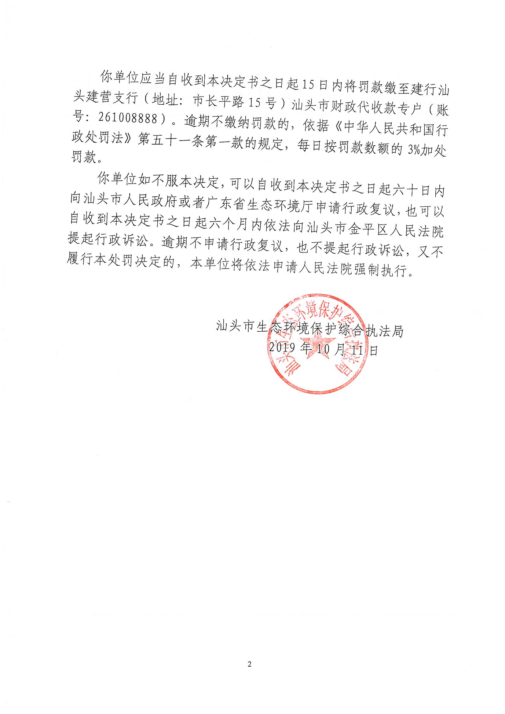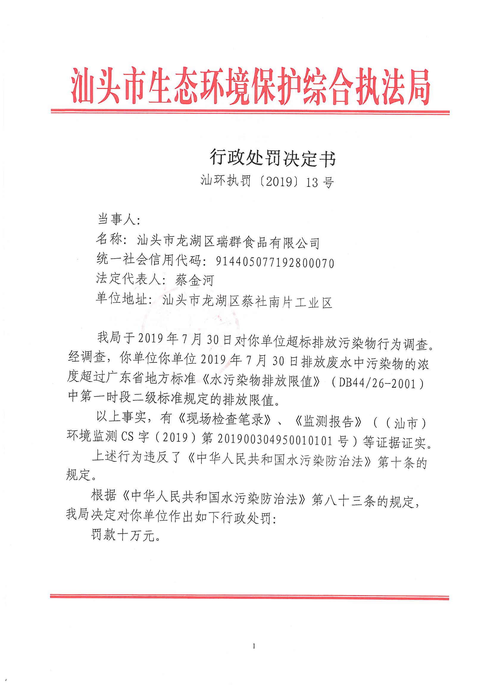 行政处罚决定书(汕环执罚〔2019〕13号)