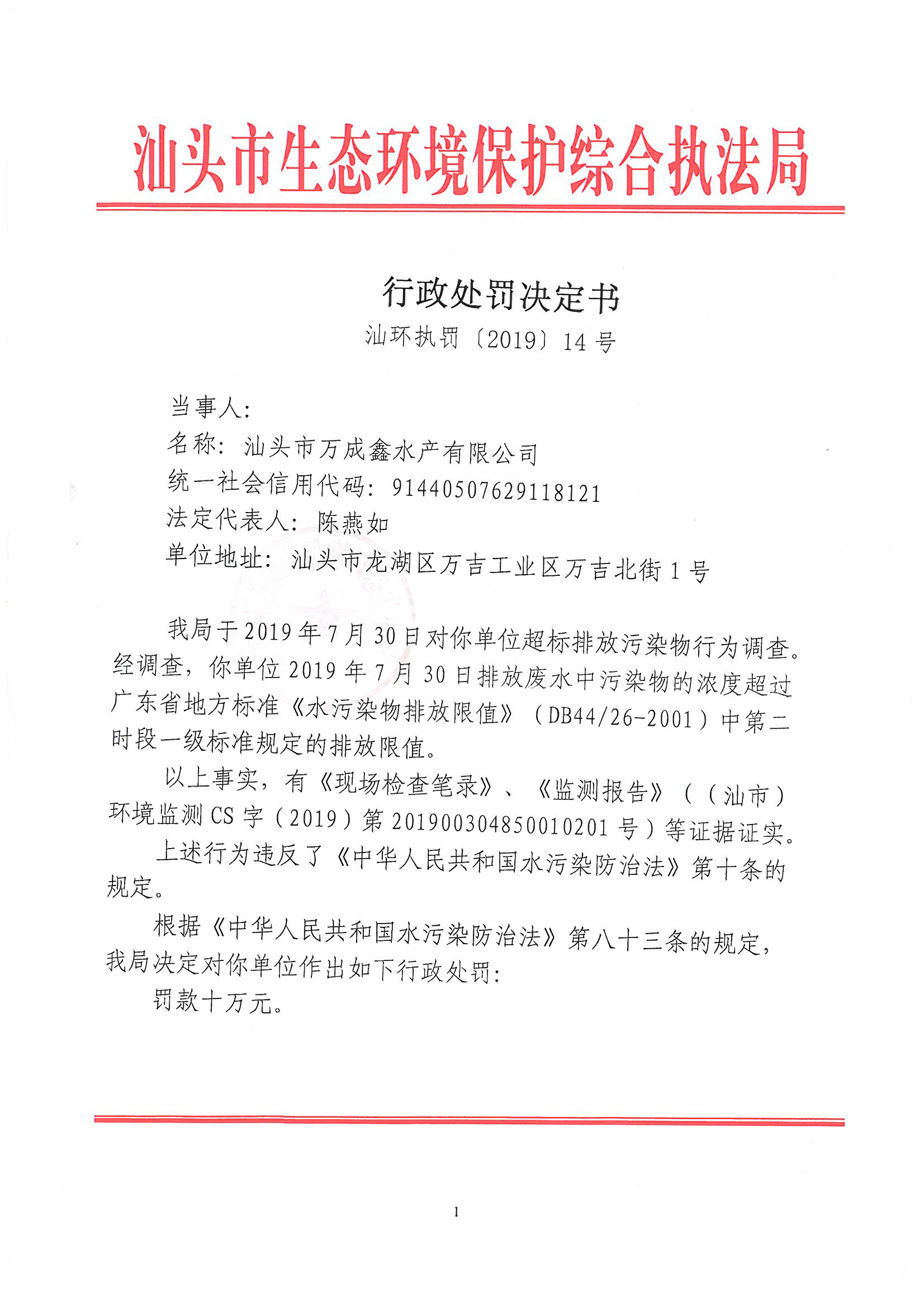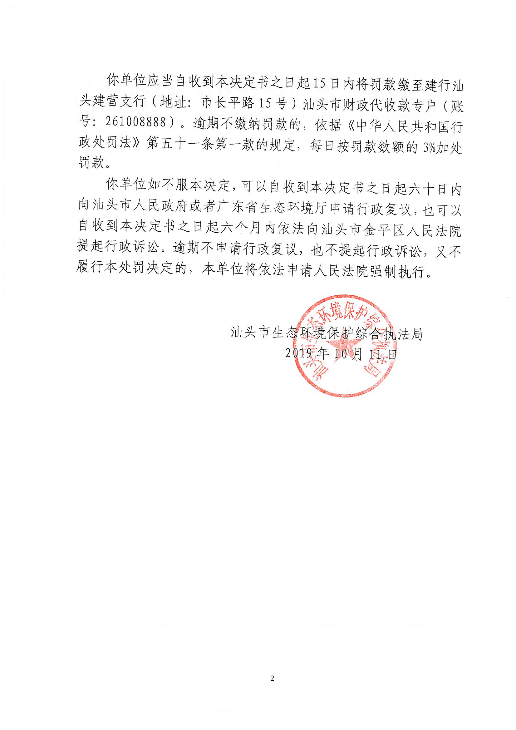 行政处罚决定书(汕环执罚〔2019〕14号)