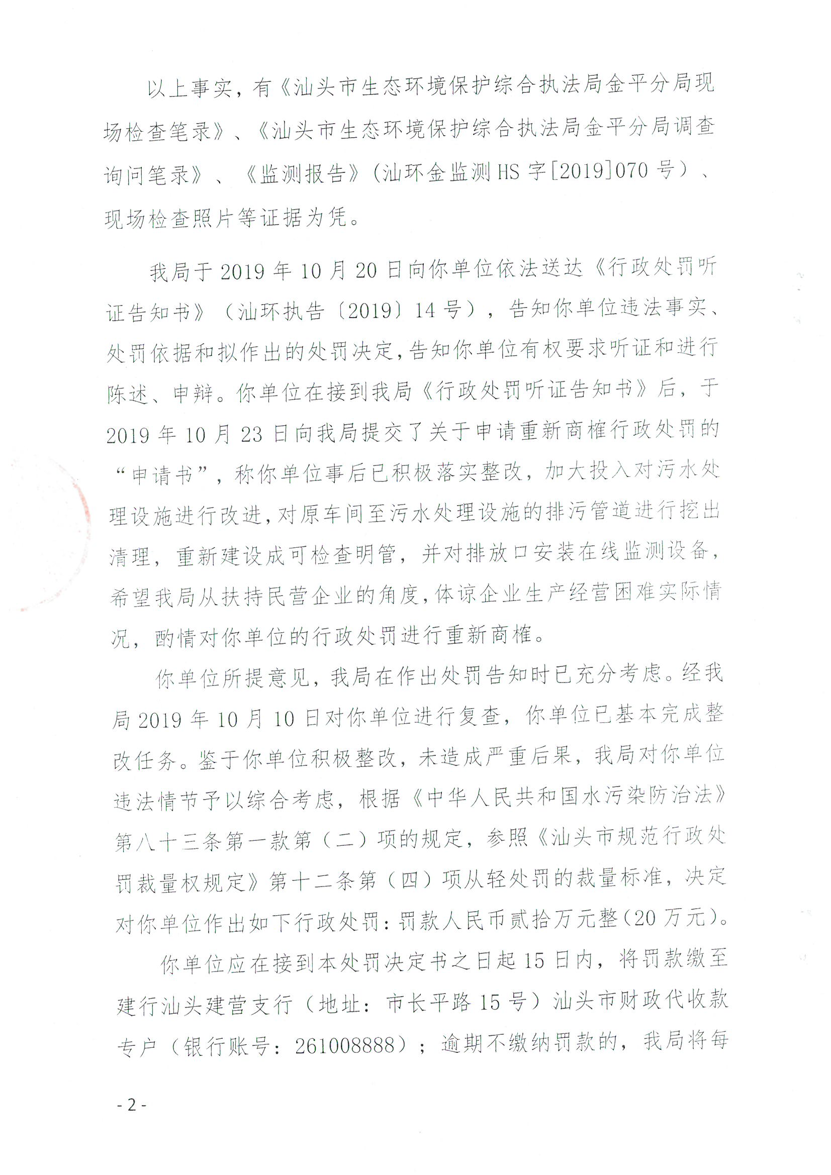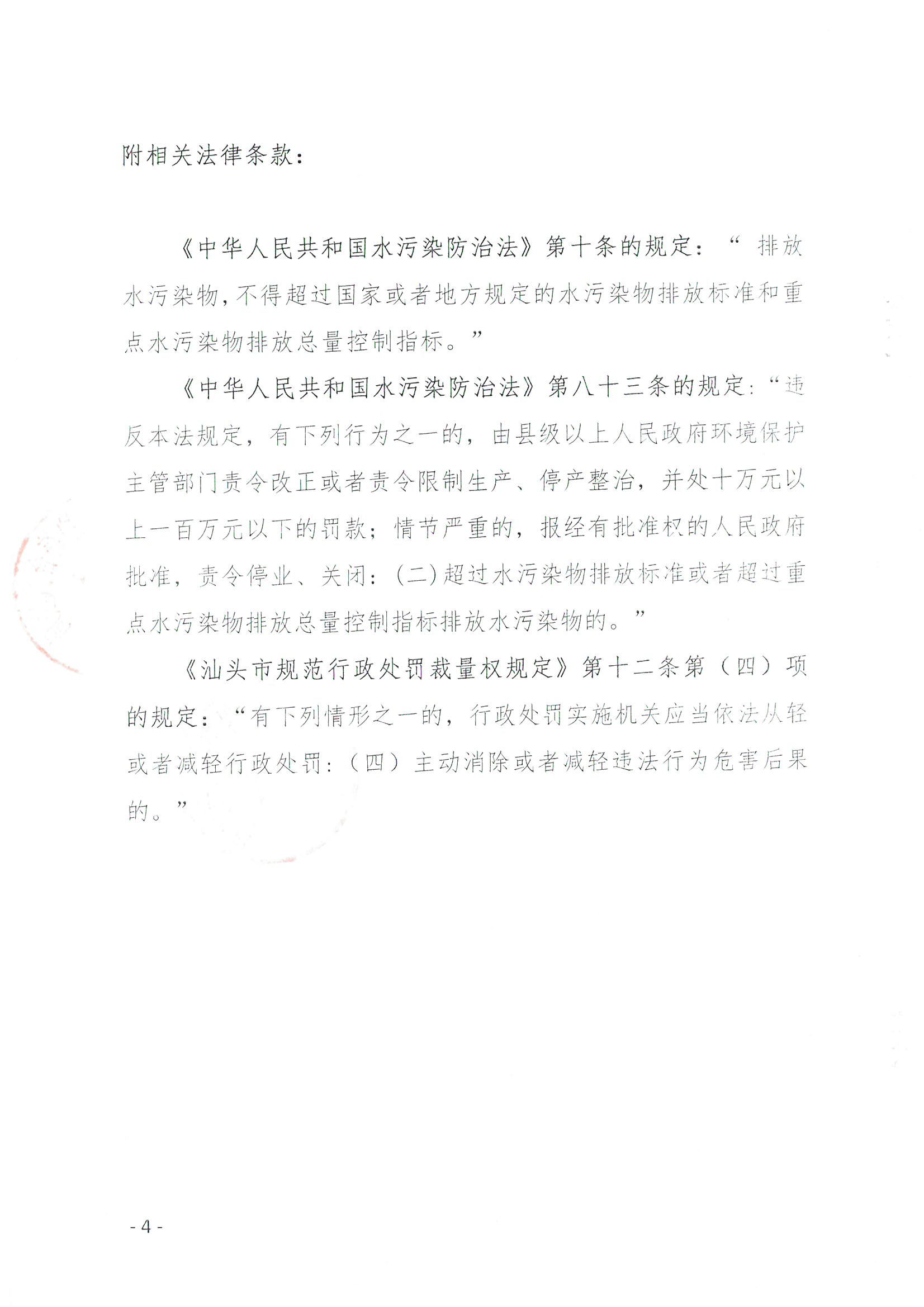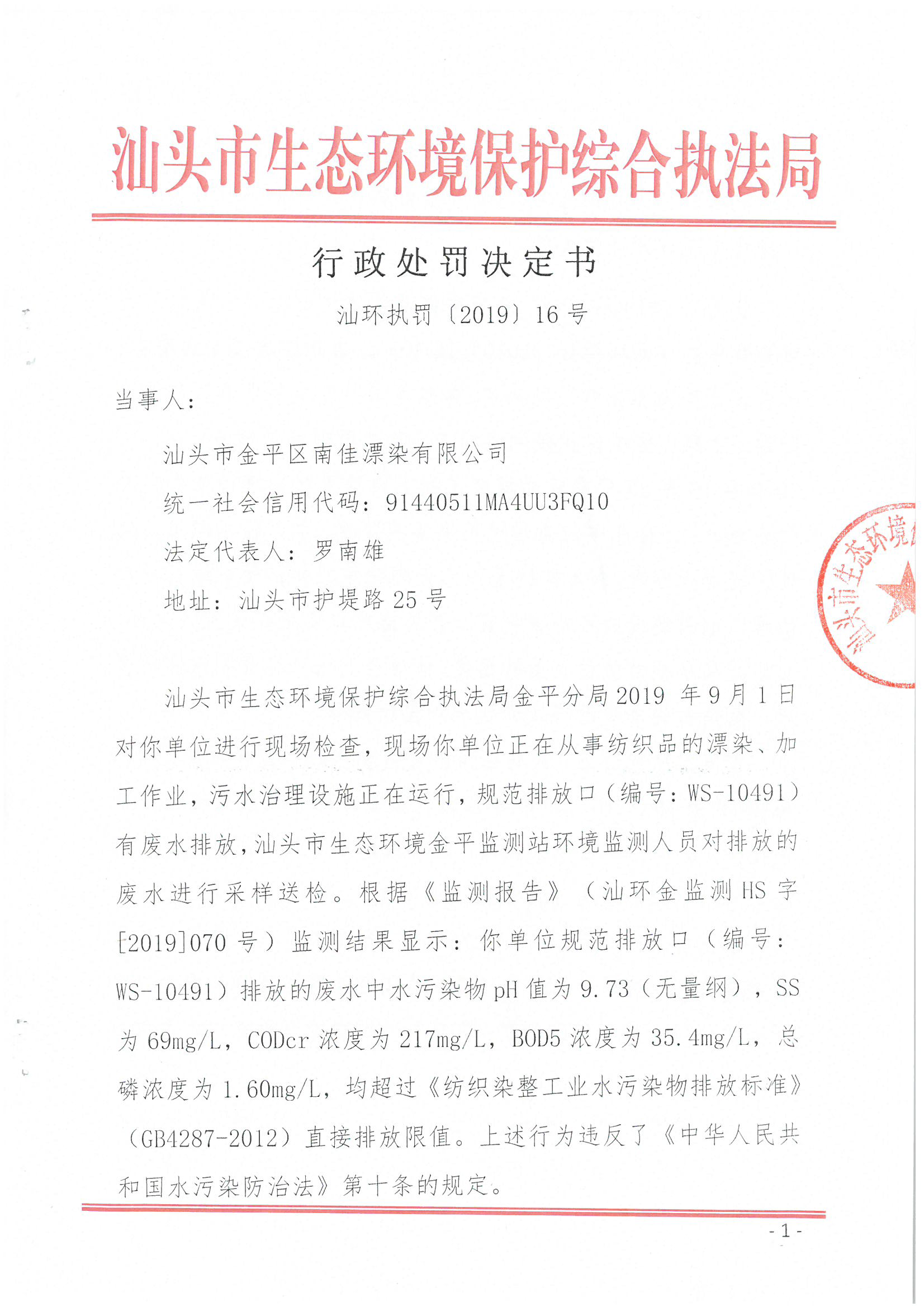 行政处罚决定书(汕头市金平区南佳漂染有限公司-水超标)