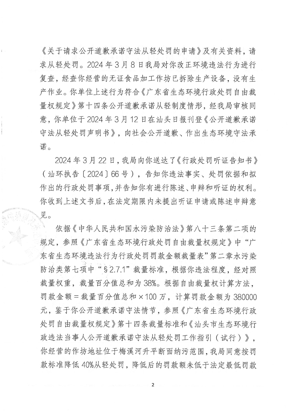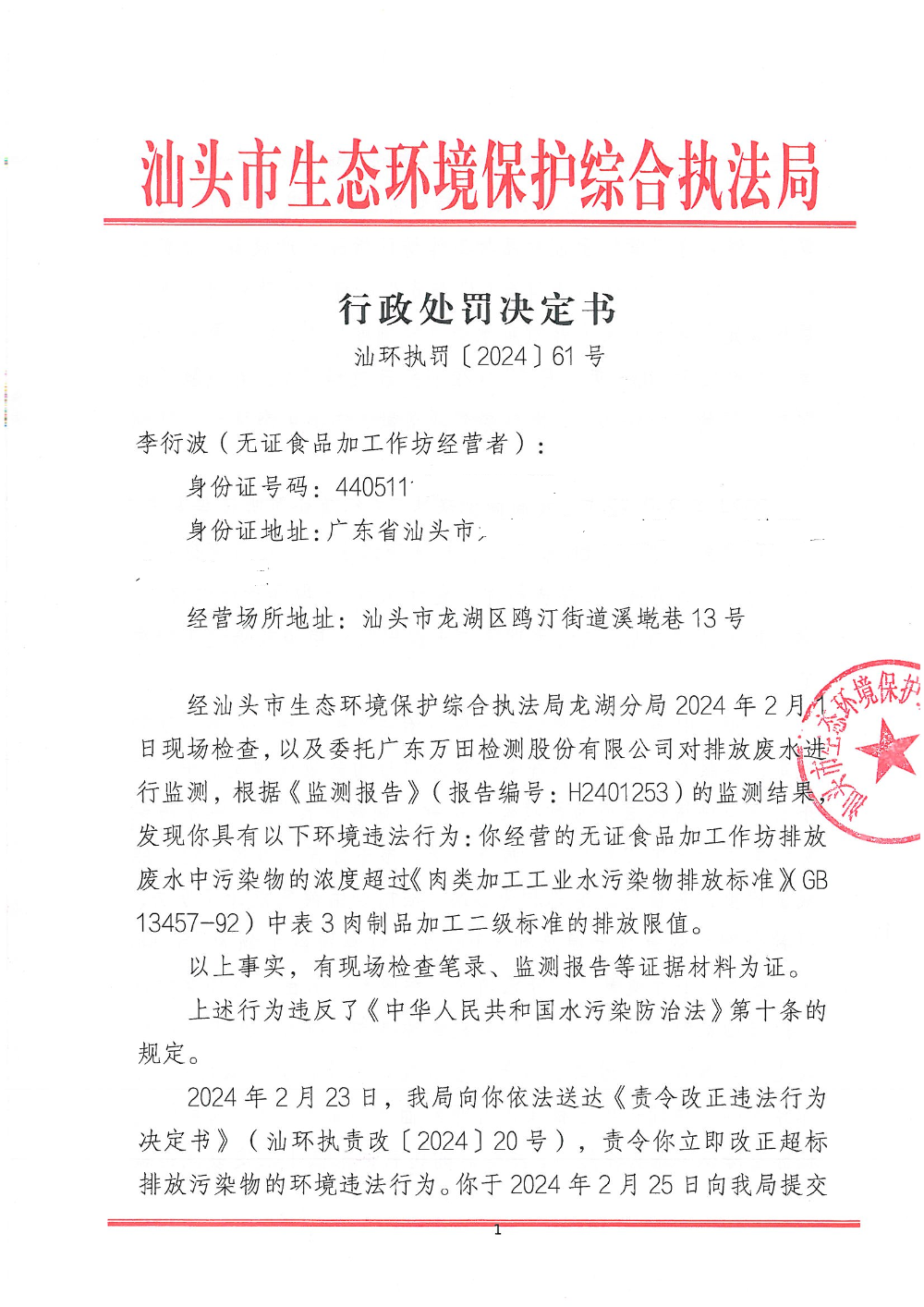 【龙湖】行政处罚决定书(汕环执罚〔2024〕61号)