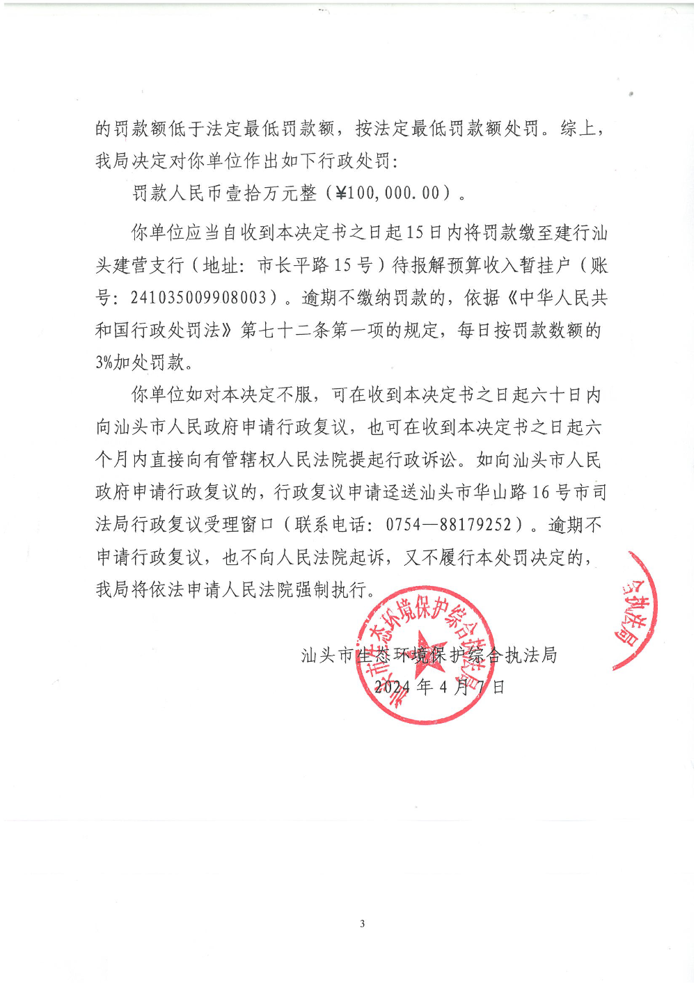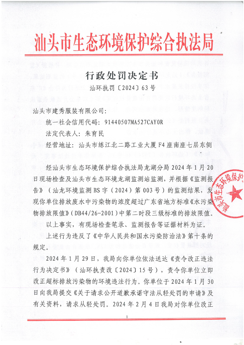 【龙湖】行政处罚决定书(汕环执罚〔2024〕63号)