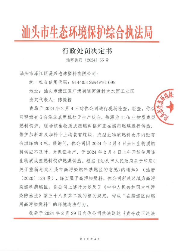 【濠江】行政处罚决定书(汕环执罚〔2024〕55号)