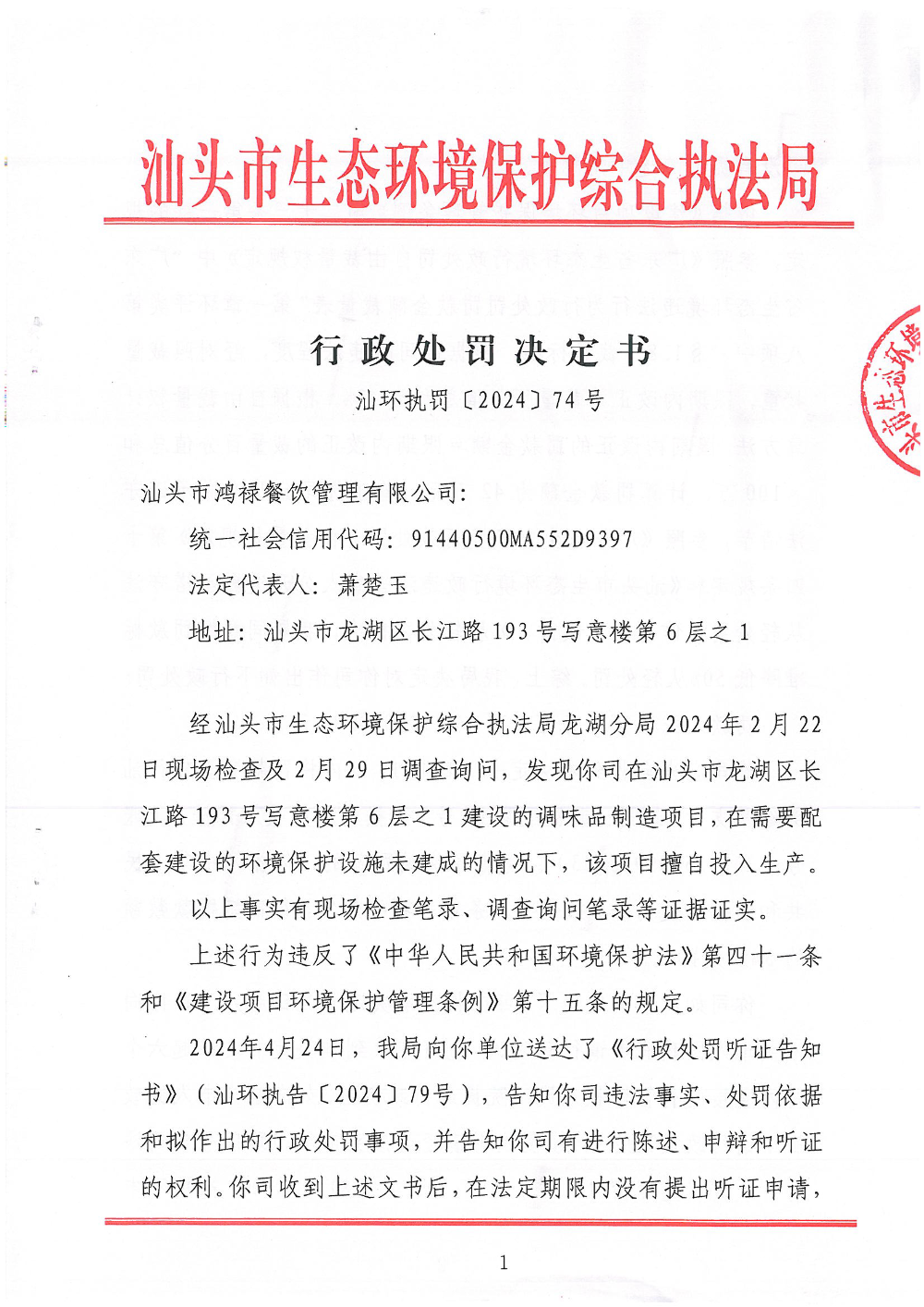 【龙湖】行政处罚决定书(汕环执罚〔2024〕74号)