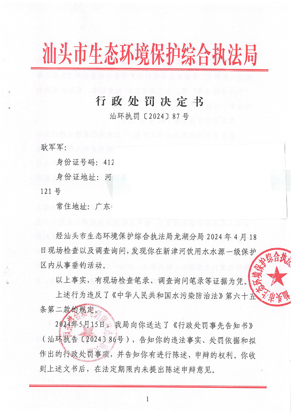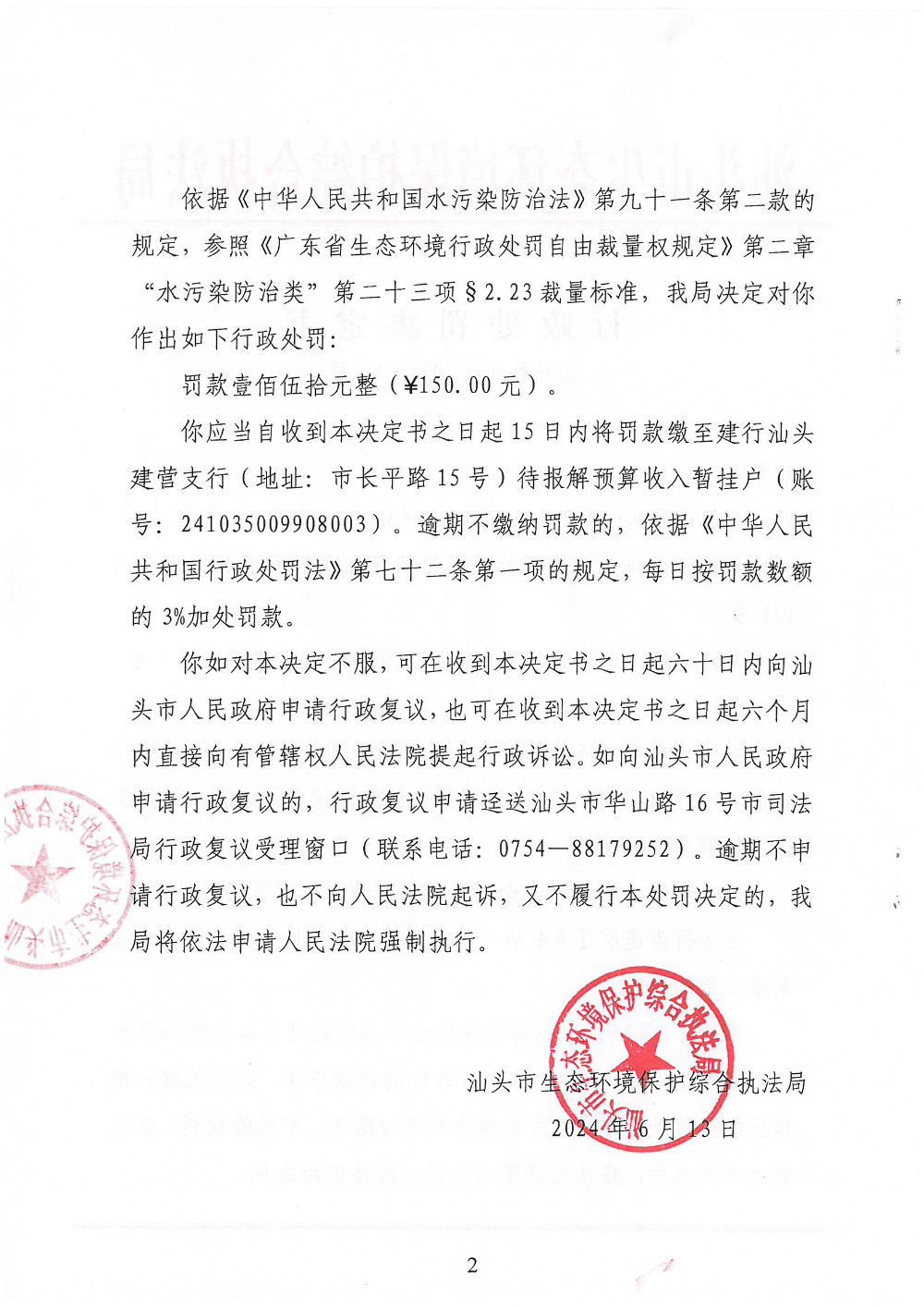 【龙湖】行政处罚决定书(汕环执罚〔2024〕87号)