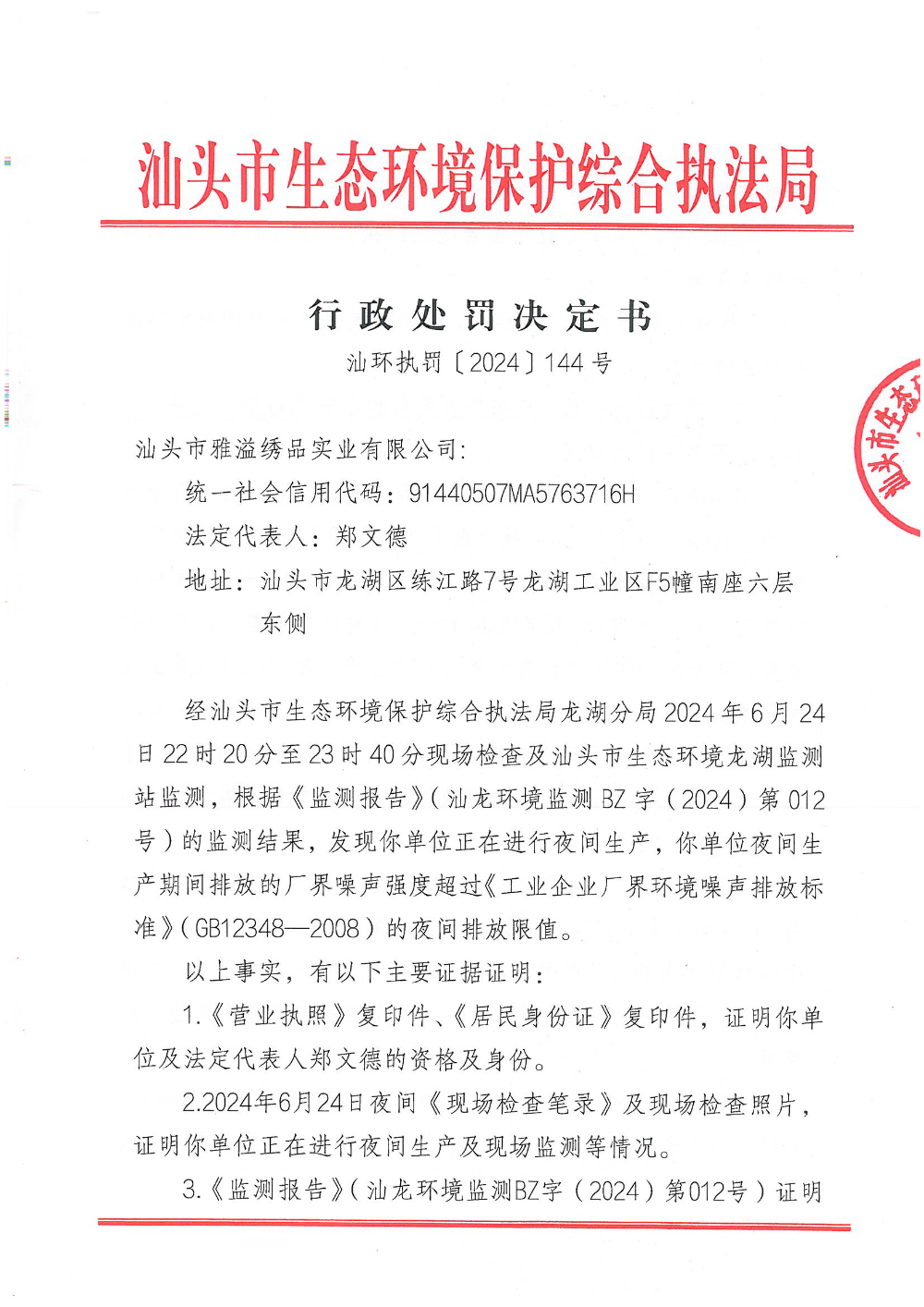 【龙湖】行政处罚决定书(汕环执罚〔2024〕144号)