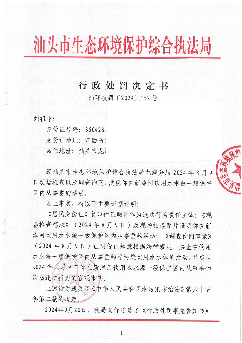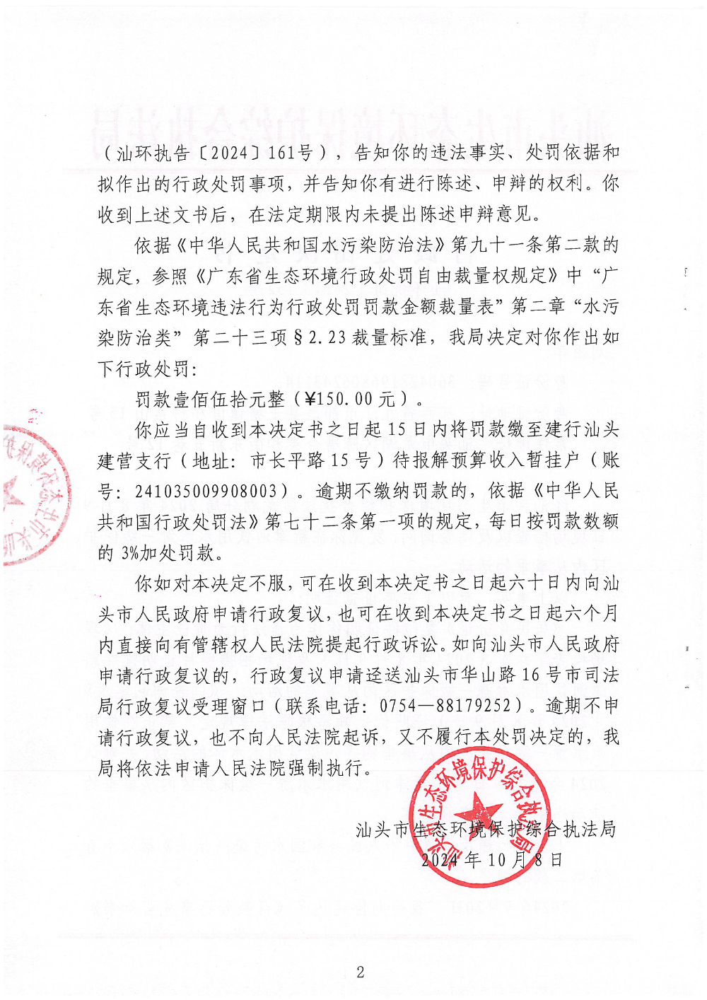 【龙湖】行政处罚决定书(汕环执罚〔2024〕152号)