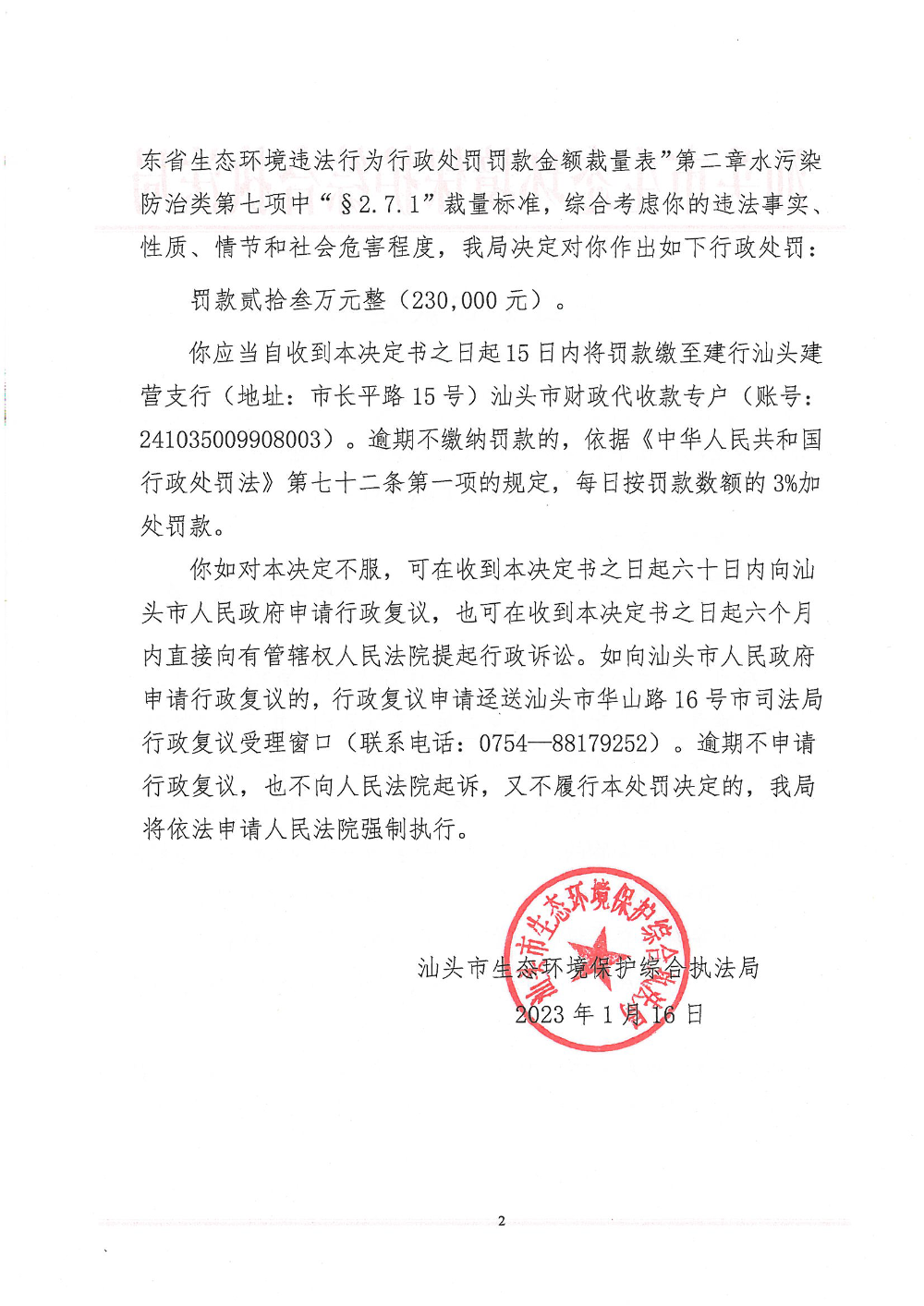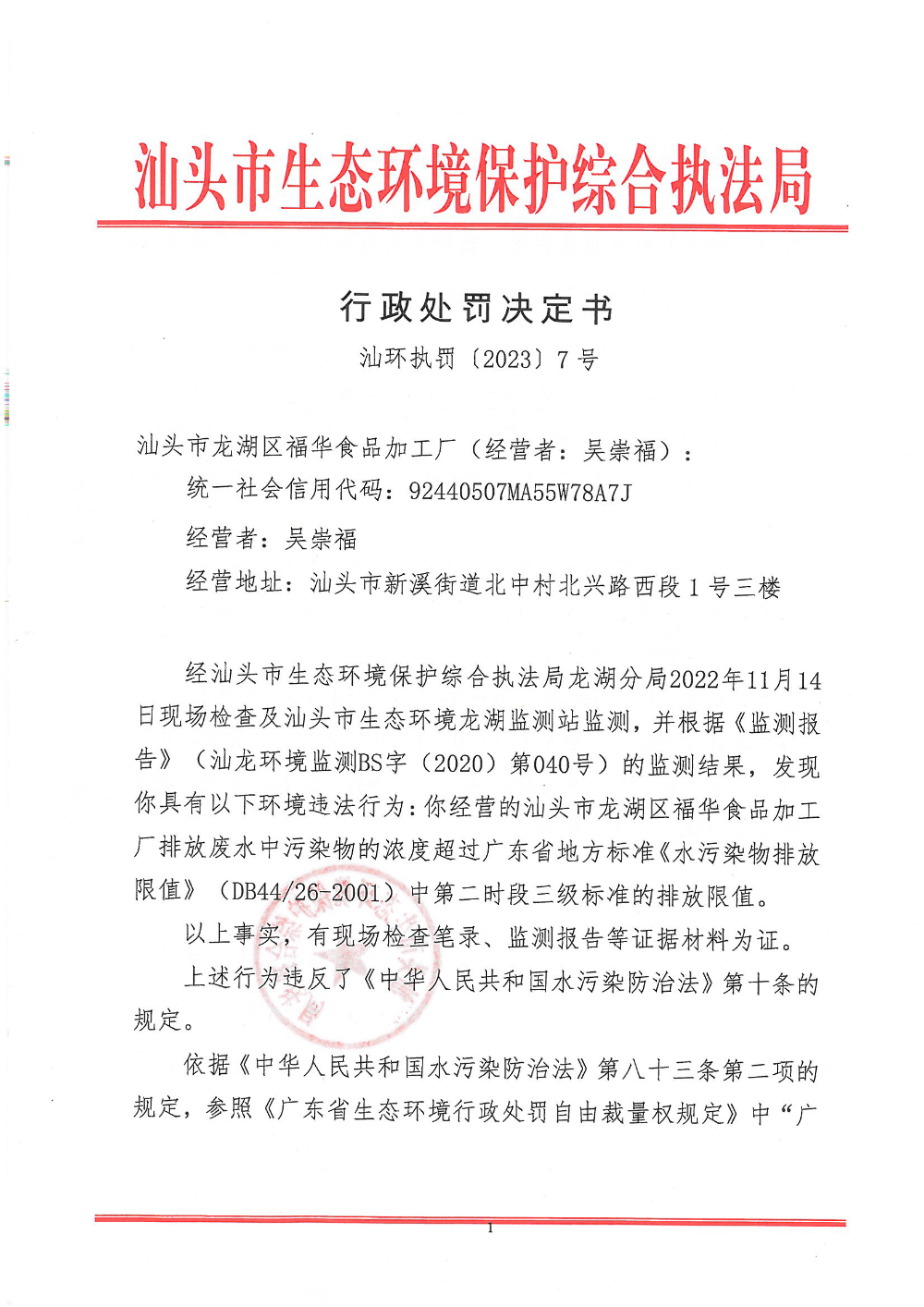 【龙湖】行政处罚决定书(汕环执罚〔2023〕7号)