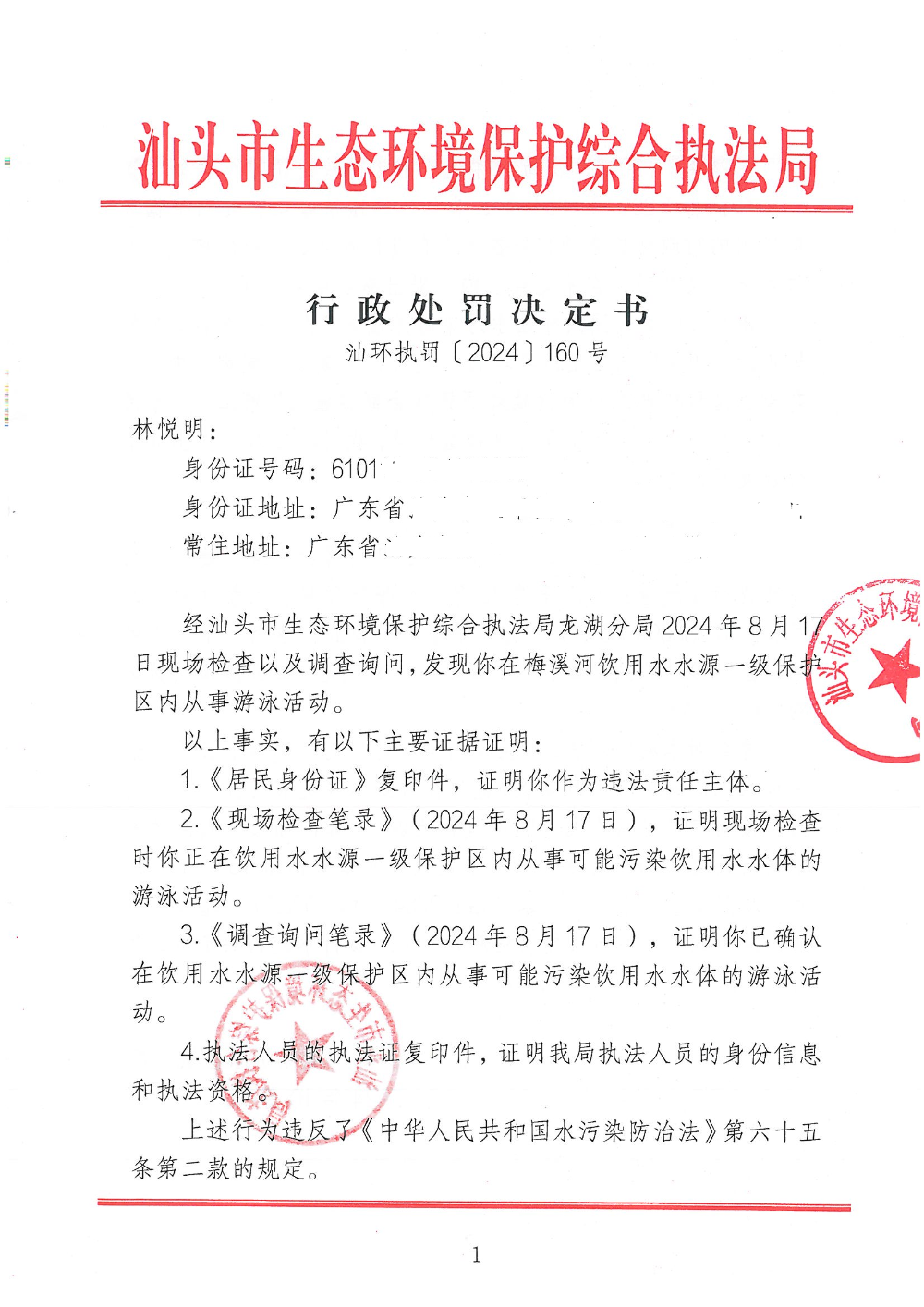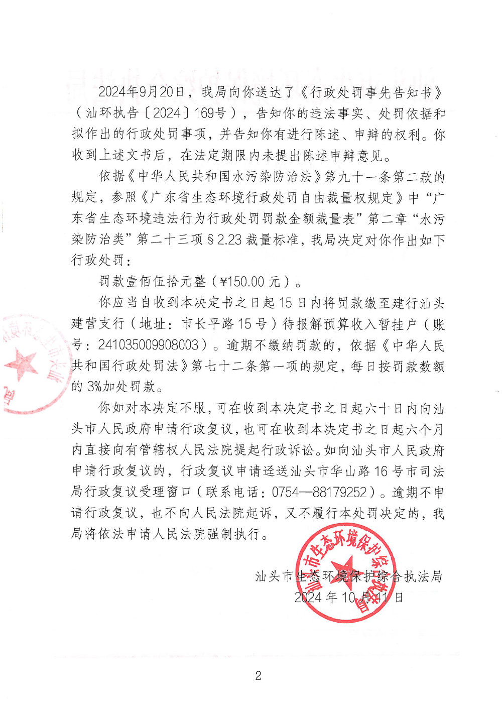 【龙湖】行政处罚决定书(汕环执罚〔2024〕160号)