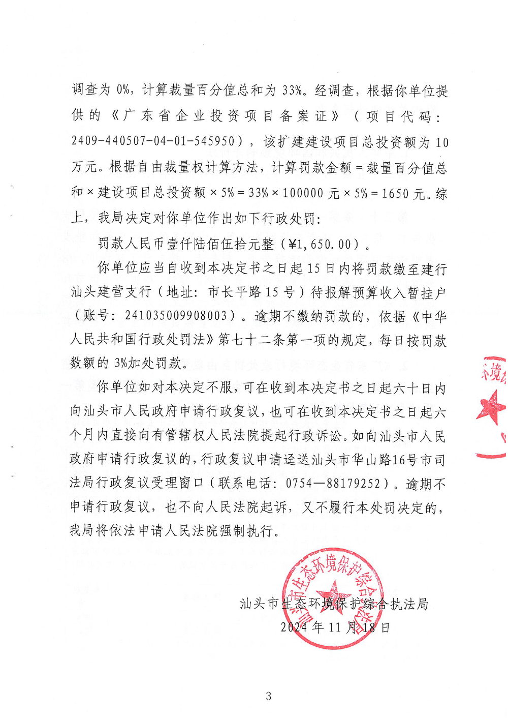 【龙湖】行政处罚决定书(汕环执罚〔2024〕185号)