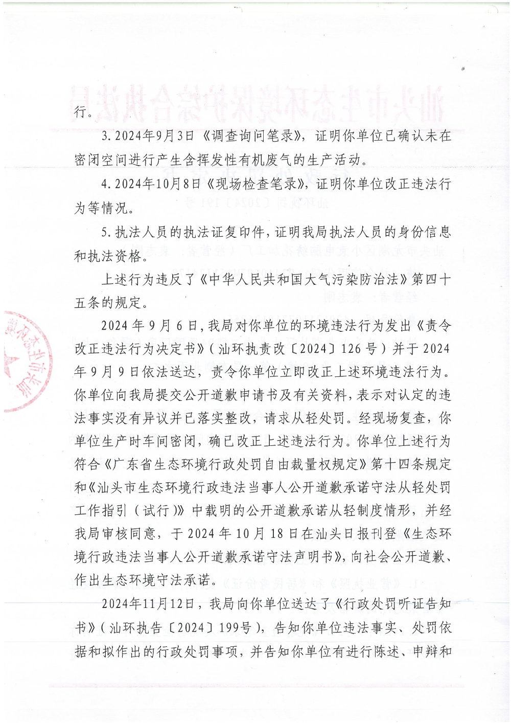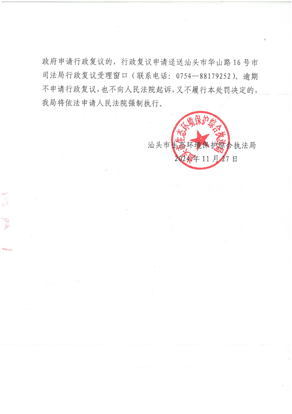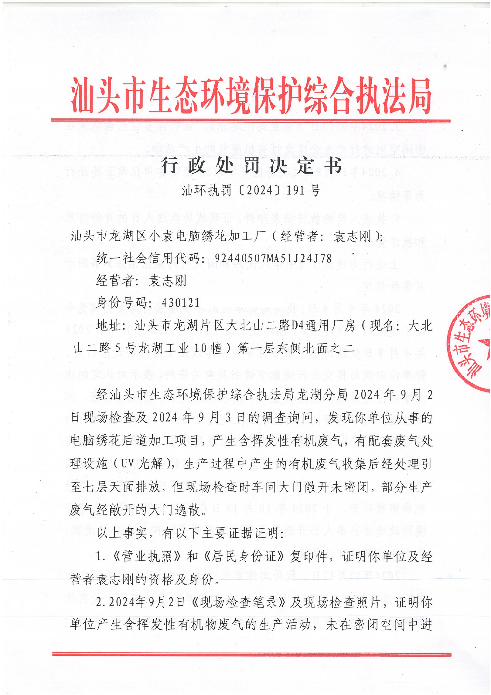 【龙湖】行政处罚决定书(汕环执罚〔2024〕191号)