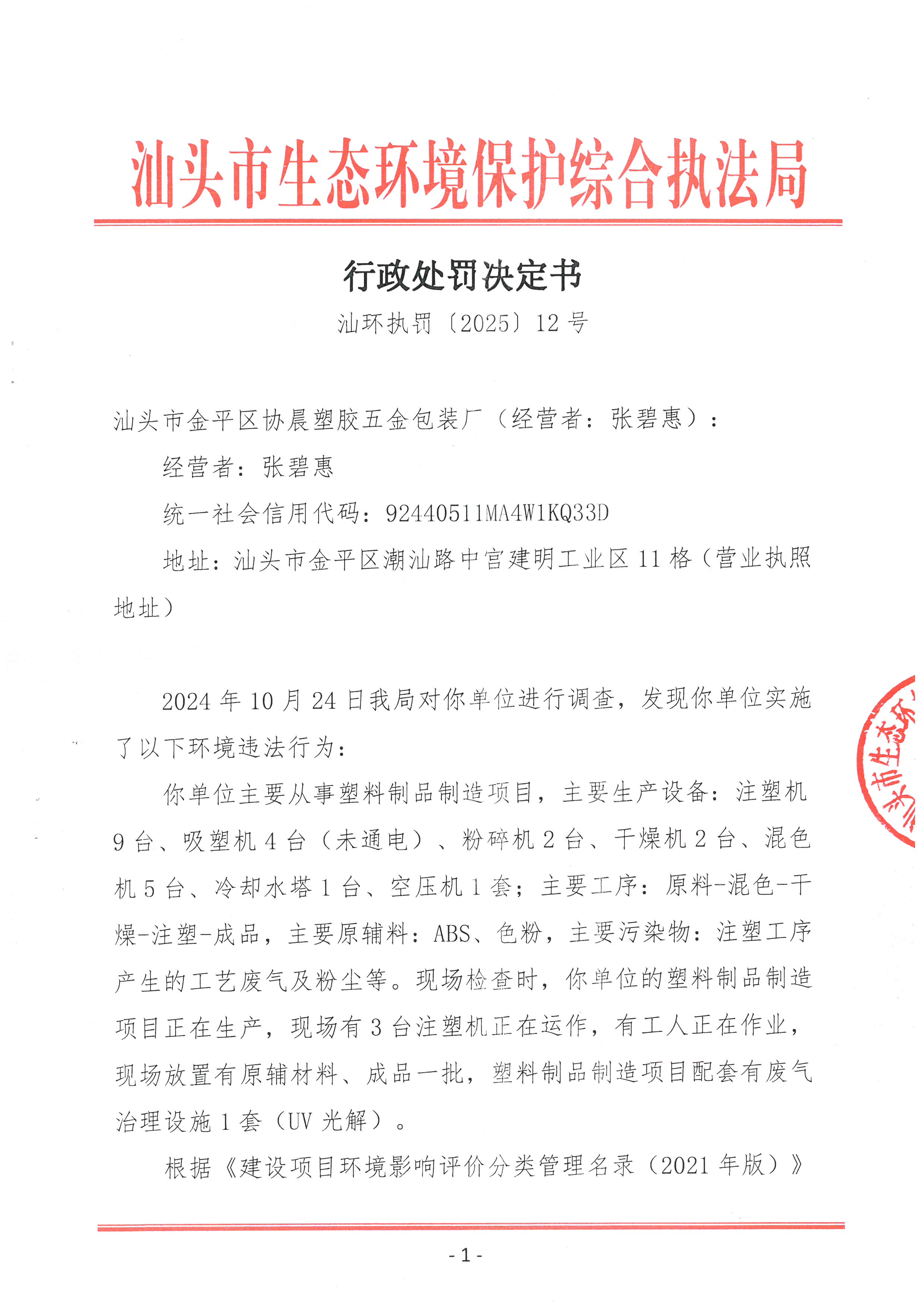 【金平】行政处罚决定书(汕环执罚〔2025〕12号)
