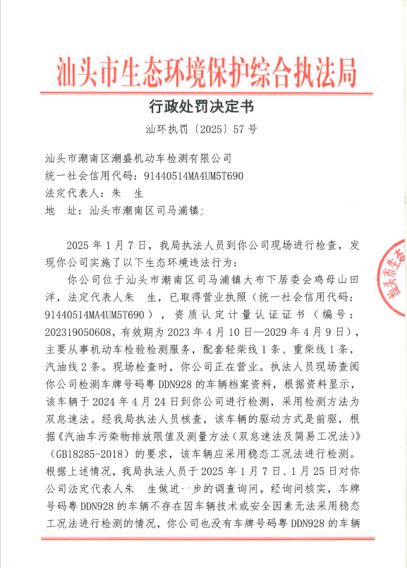 【潮南】行政处罚决定书(汕环执罚〔2025〕57号)