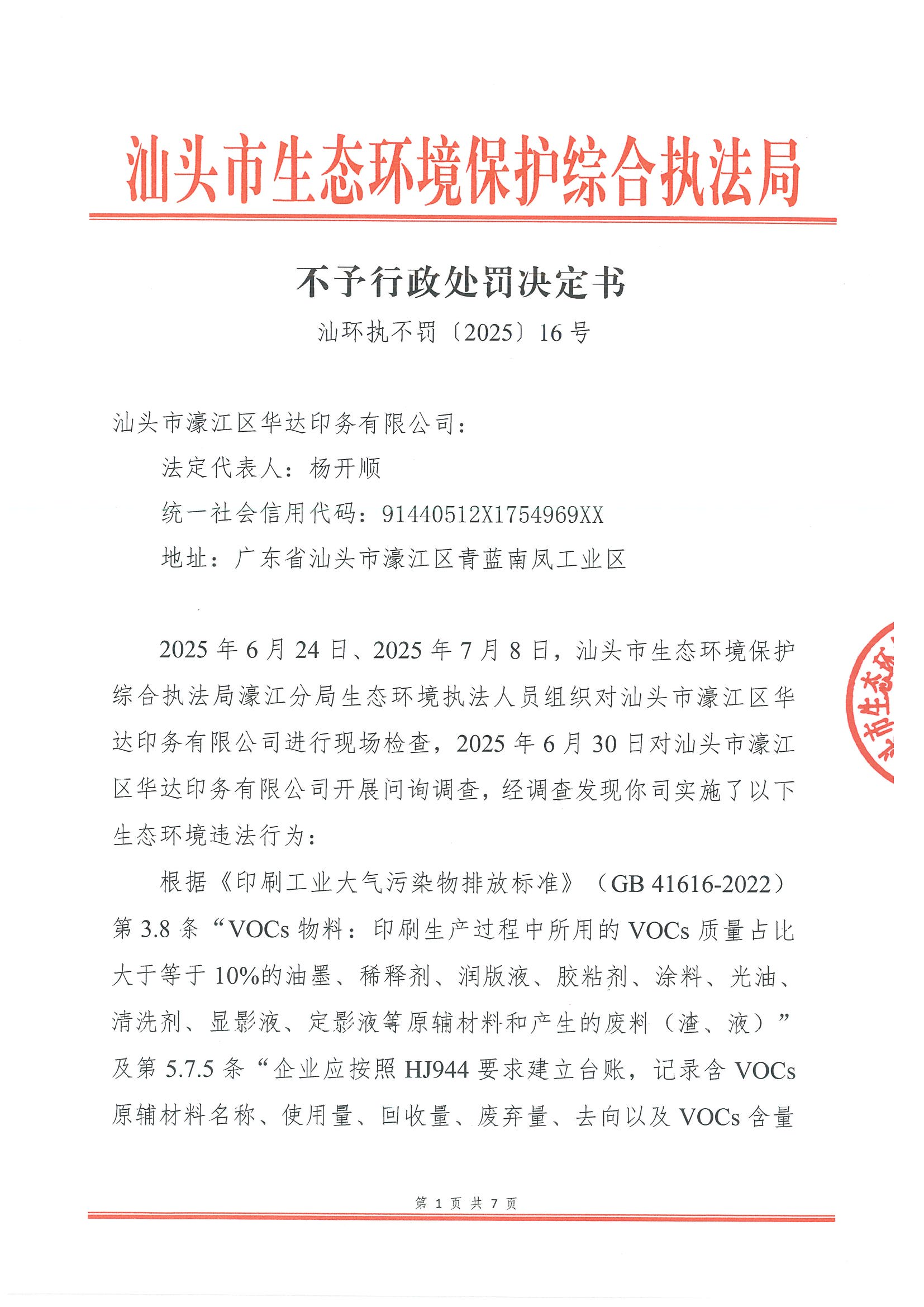 【濠江】不予行政处罚决定书(汕环执不罚〔2025〕16号)
