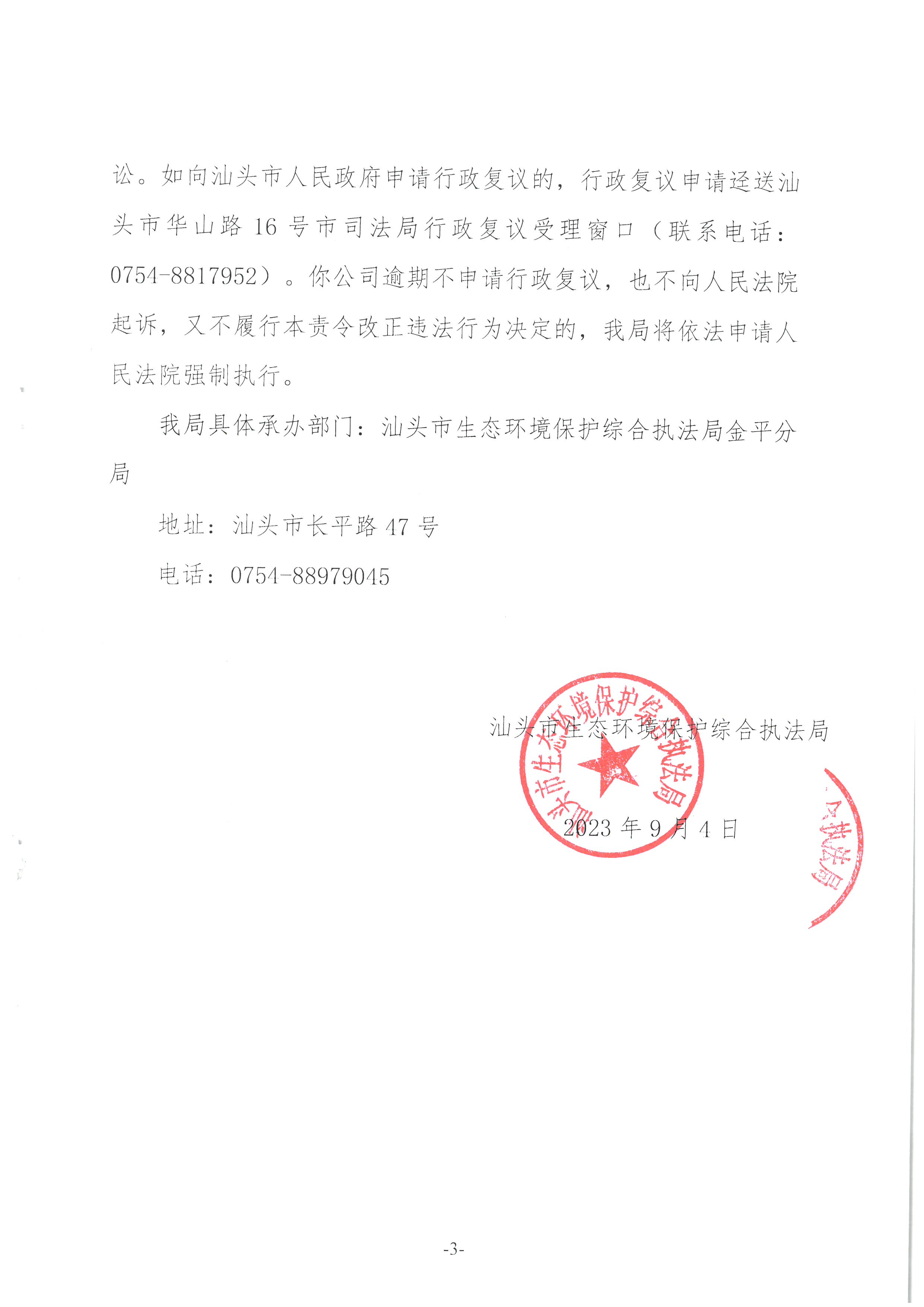 【金平】责令改正违法行为决定书(汕环执责改〔2023〕167号)