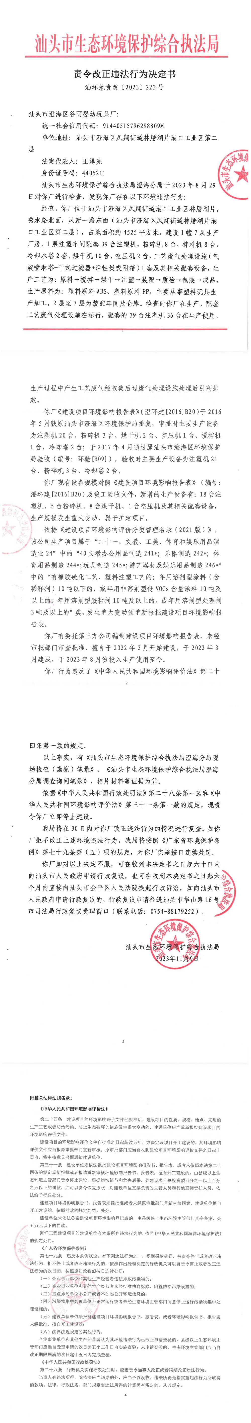 【澄海】责令改正违法行为决定书(汕环执责改〔2023〕223号)