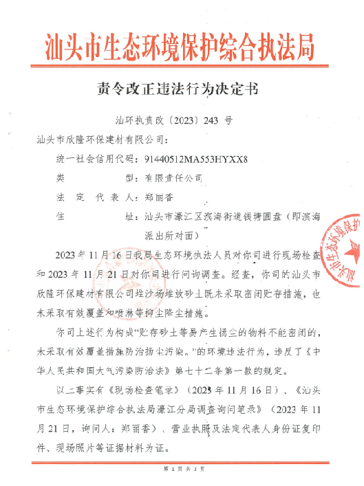 【濠江】责令改正违法行为决定书(汕环执改〔2023〕243号)