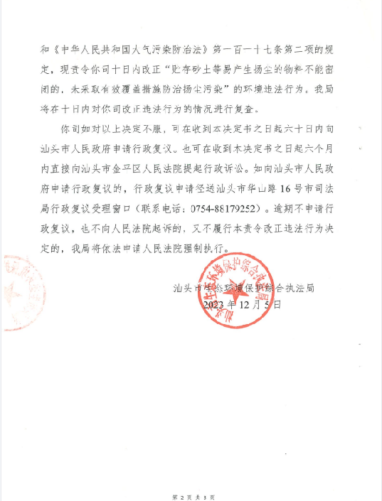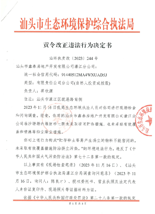 【濠江】责令改正违法行为决定书(汕环执改〔2023〕244号)