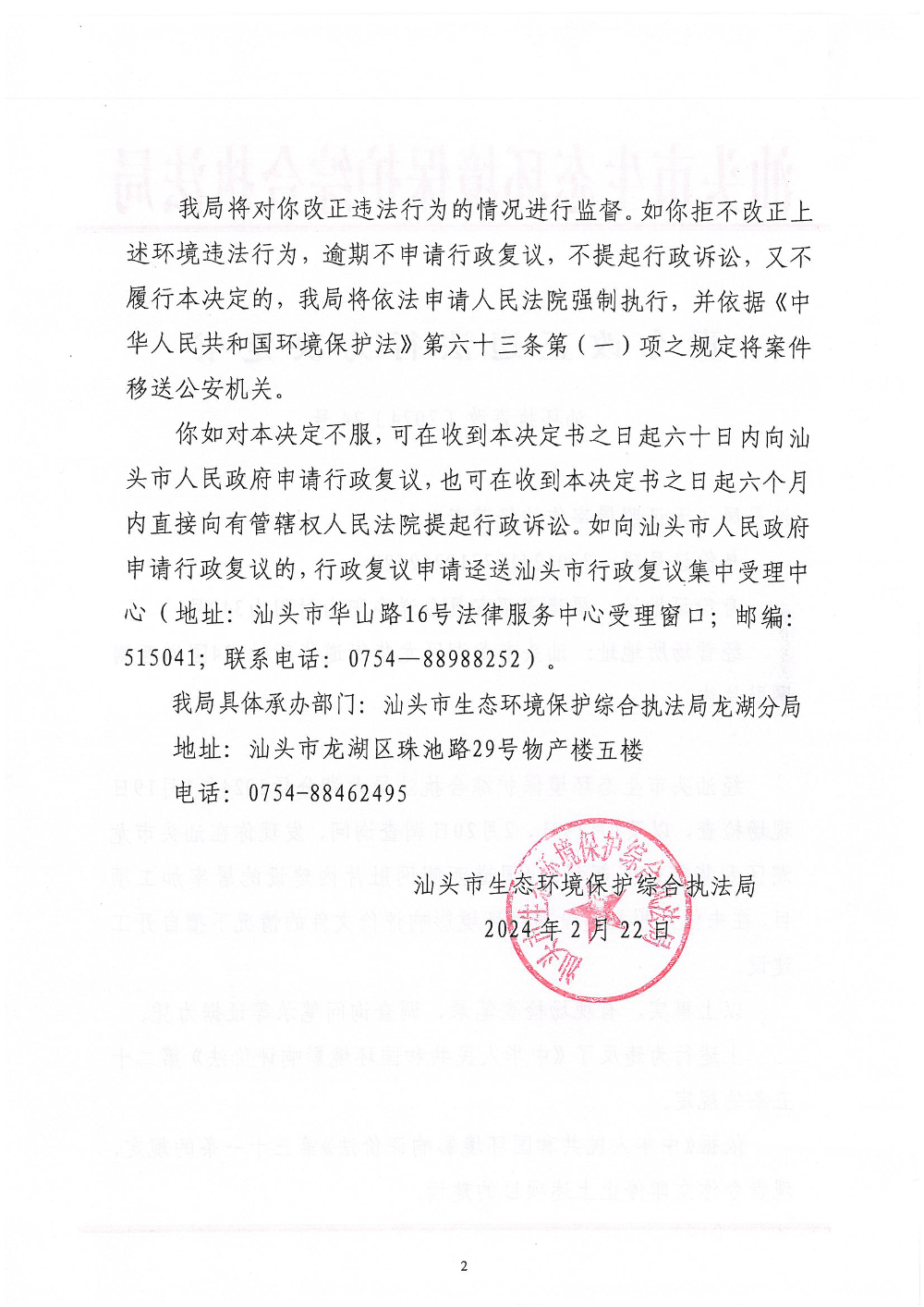 【龙湖】责令改正违法行为决定书(汕环执责改〔2024〕24号)