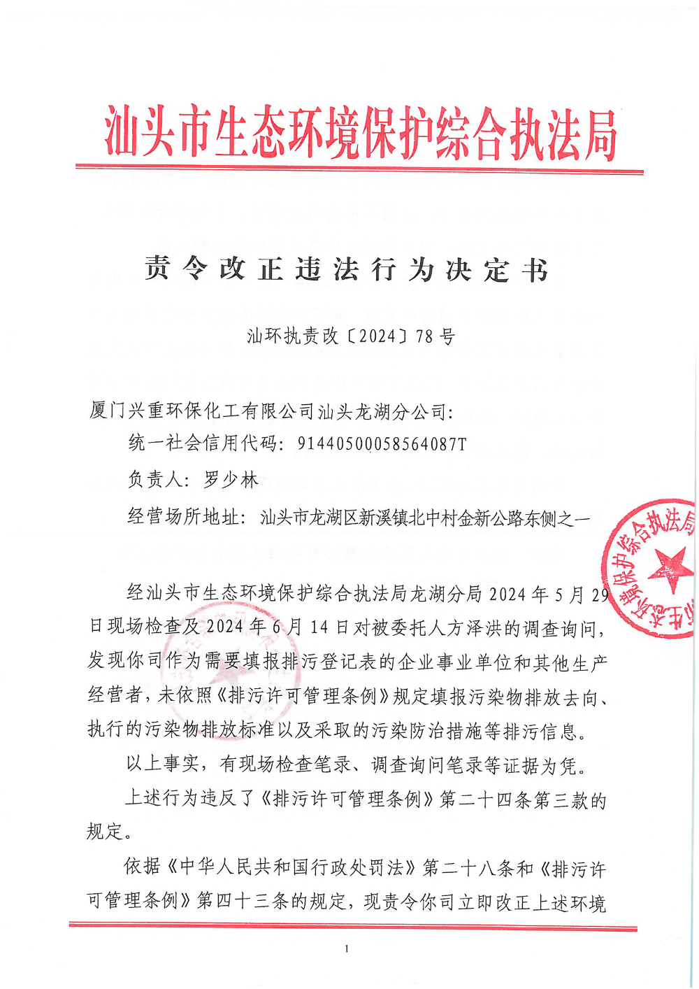 【龙湖】责令改正违法行为决定书(汕环执责改〔2024〕78号)