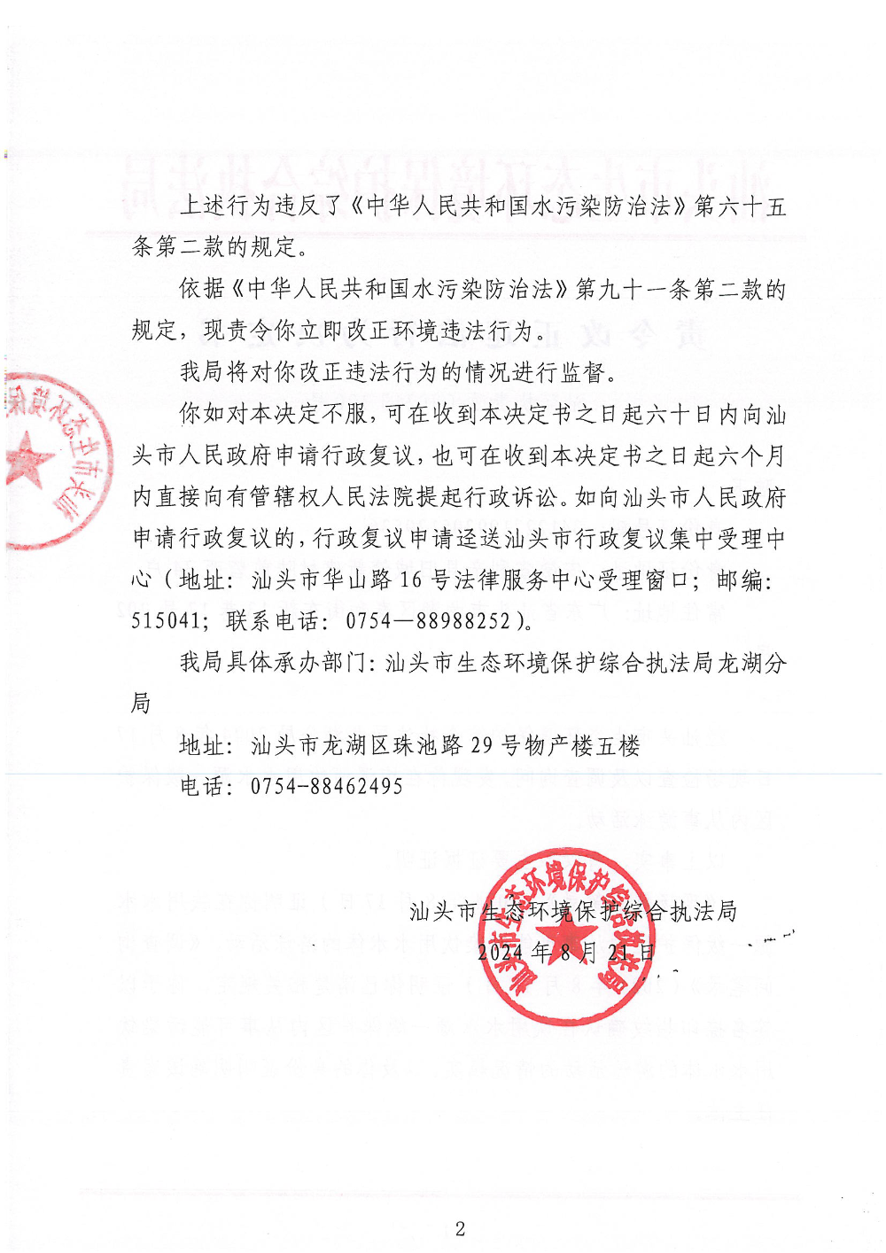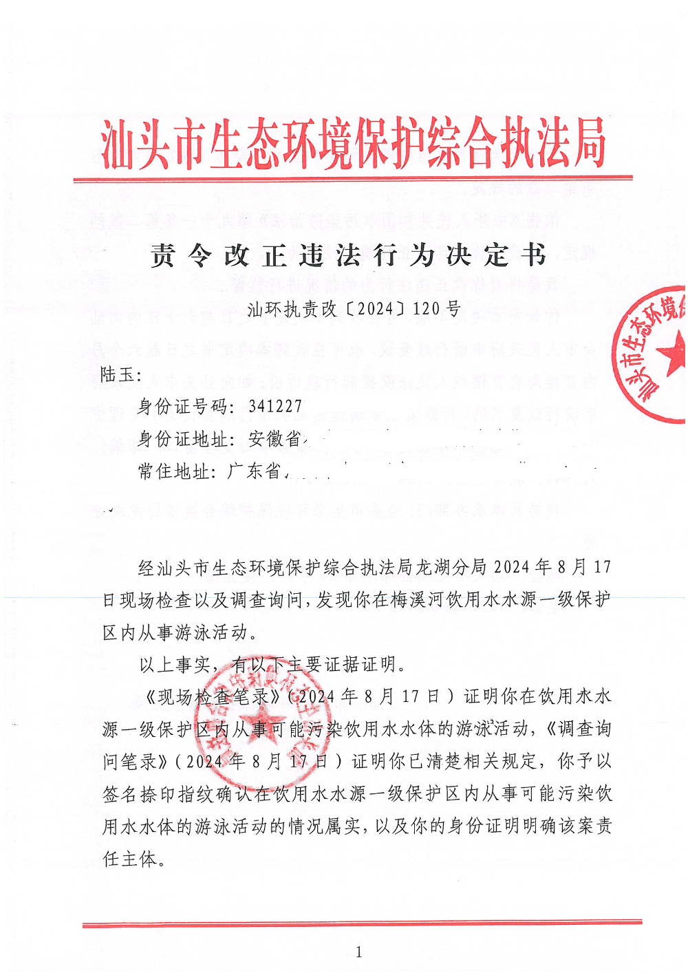 【龙湖】责令改正违法行为决定书(汕环执责改〔2024〕120号)