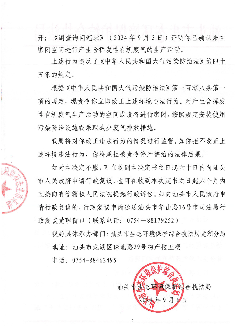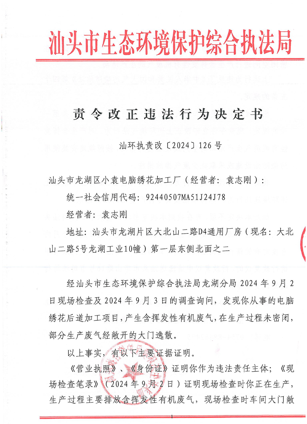 【龙湖】责令改正违法行为决定书(汕环执责改〔2024〕126号)